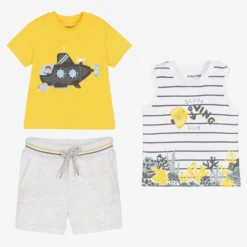 Little boys three-piece shorts and T-shirts set by Mayoral, made in soft cotton jersey. The yellow, grey and white T-shirt and striped sleeveless T-shirt have fun sea life themed prints on the front. The grey shorts have useful pockets and an elasticated drawstring waist.