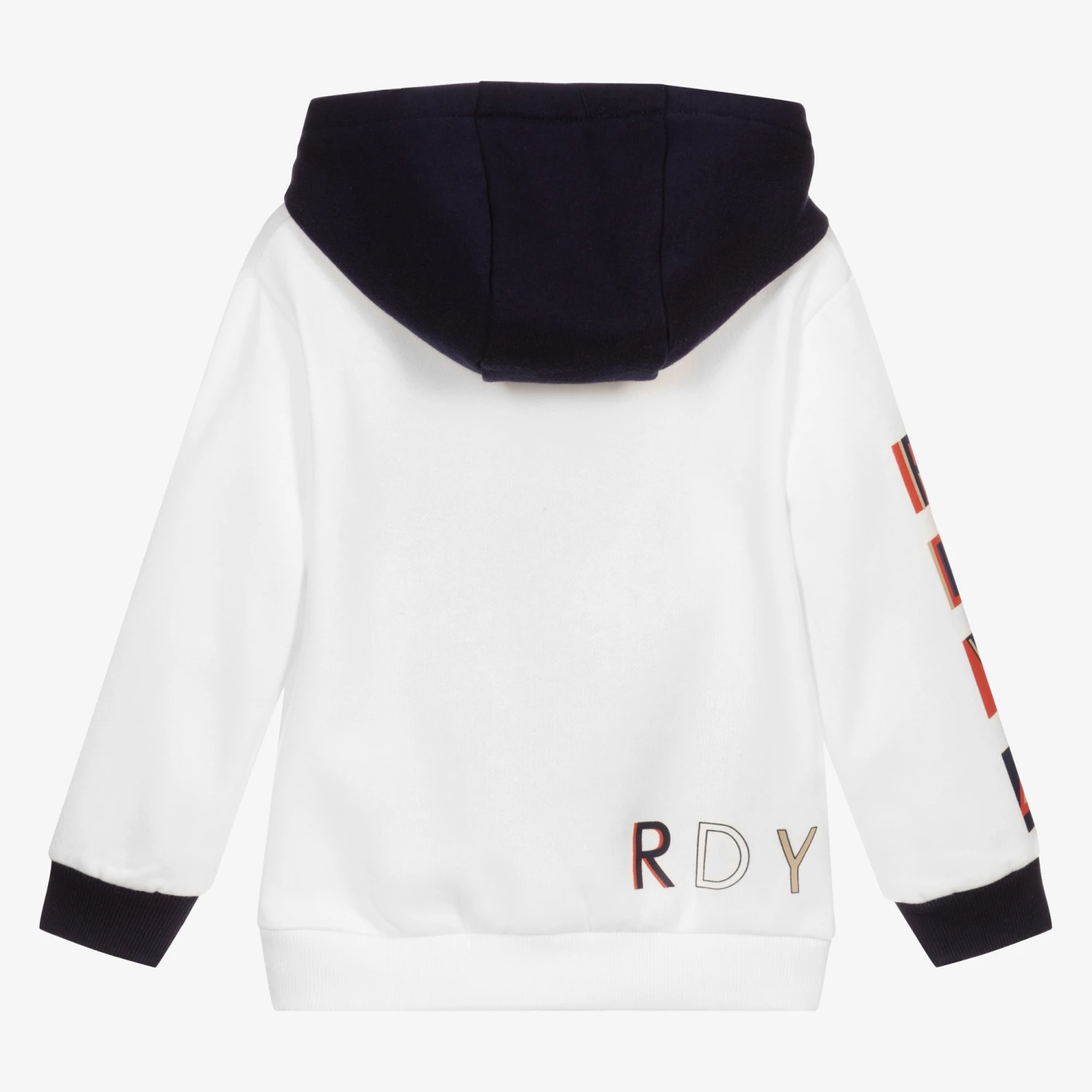 Boys ivory mid-weight cotton jersey sweatshirt by Mayoral, with a navy blue hood. It has a front pouch pocket, with red, beige and blue ‘READY’ motif prints on the front, back and arm.