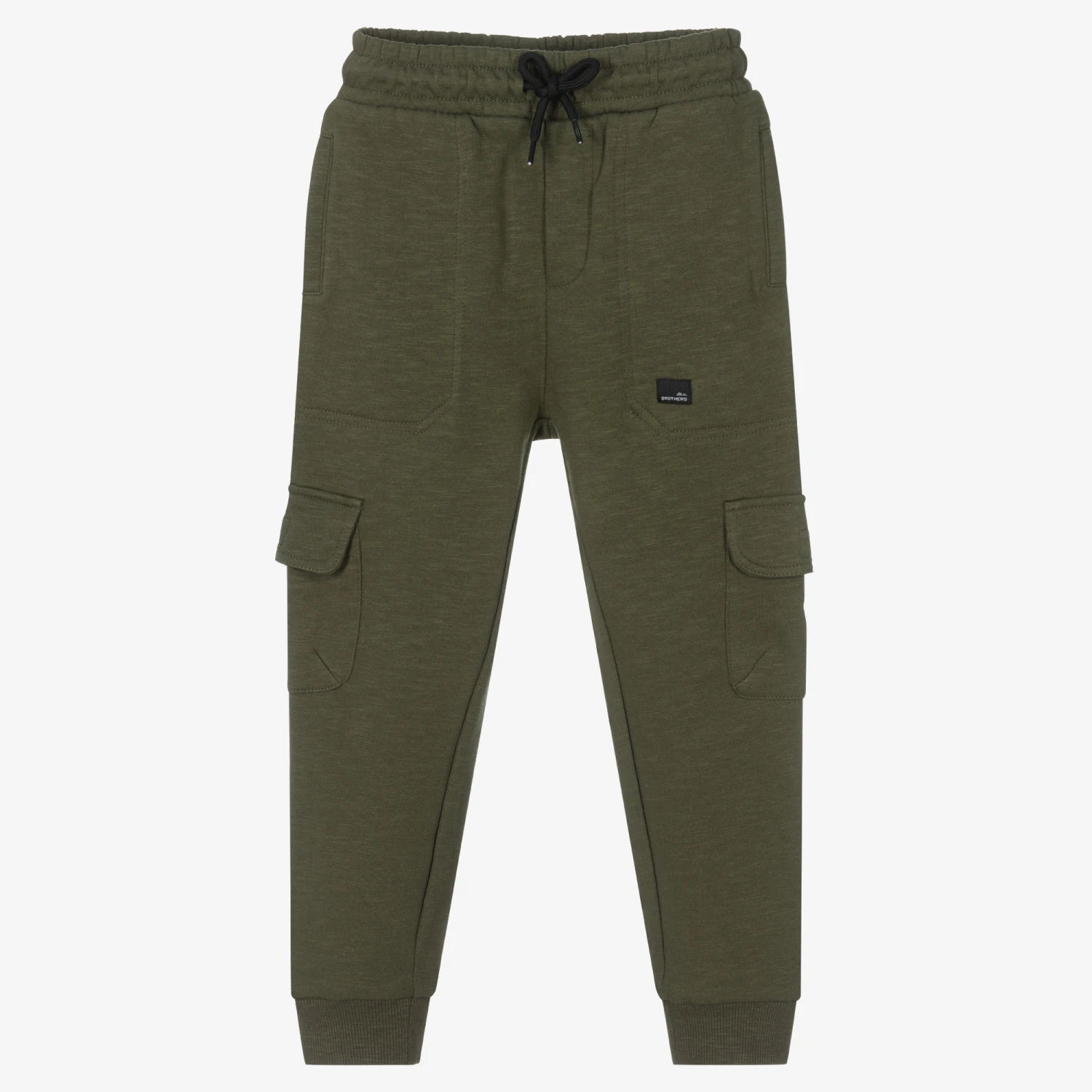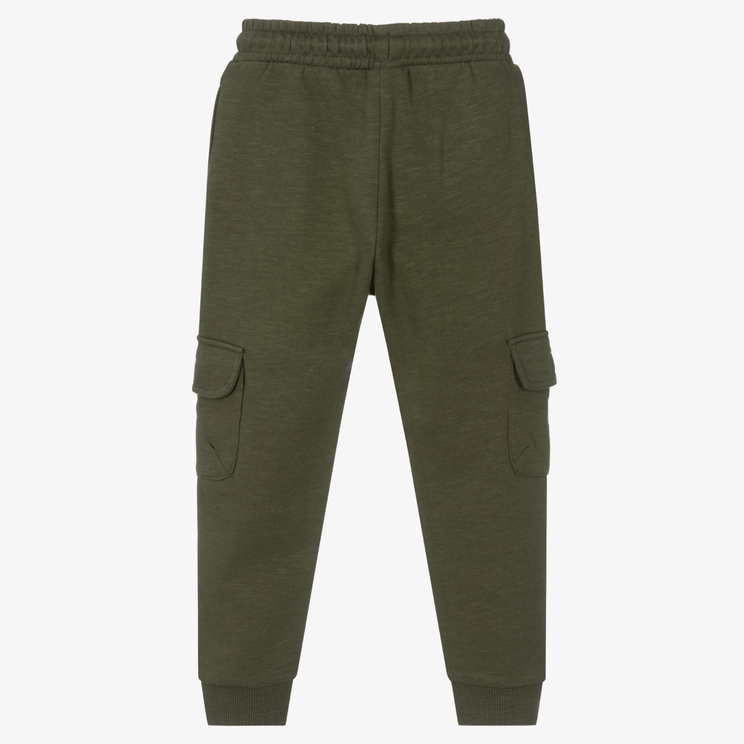 Khaki green cuffed joggers for boys, by Mayoral. Made in soft sustainable cotton jersey, they have cool cargo-style pockets on the side and a black drawstring waist. The knees are reinforced for extra durable wear and there is a black logo badge sewn on the front.
