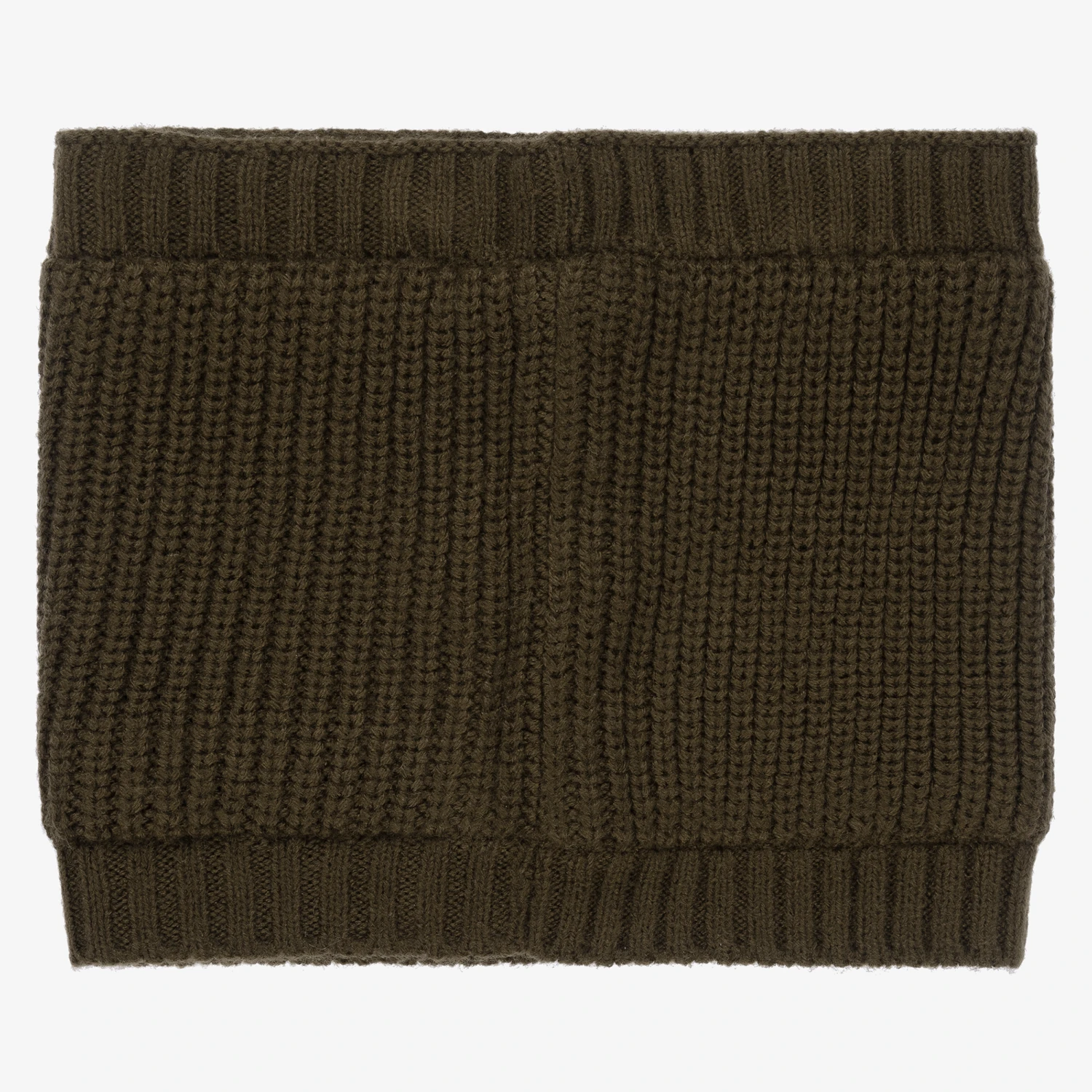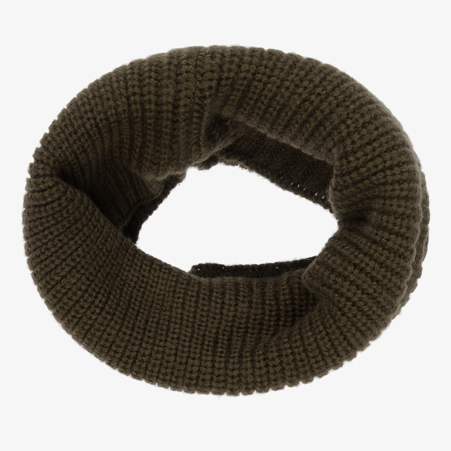 Cool khaki green snood for boys by Mayoral. Knitted in soft acrylic, it has a rubberised beige logo badge on the front, and a soft fleecy lining for a warm and cosy fit.