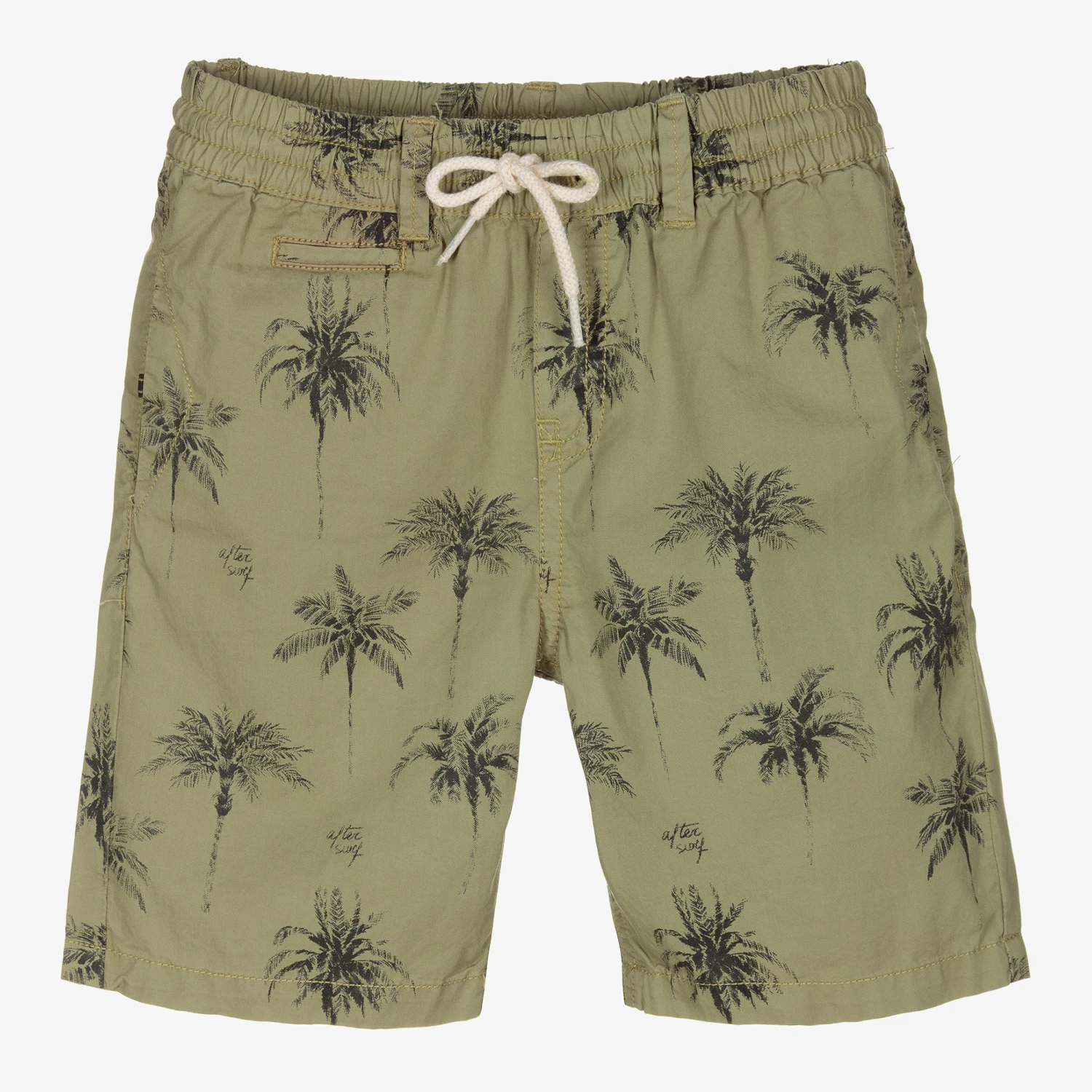 Boys khaki green shorts by Mayoral, with an all-over palm tree pattern print in black. Smooth and lightweight, they have concealed side pockets and an elasticated, drawstring waistband. There are button-fastening back pockets.