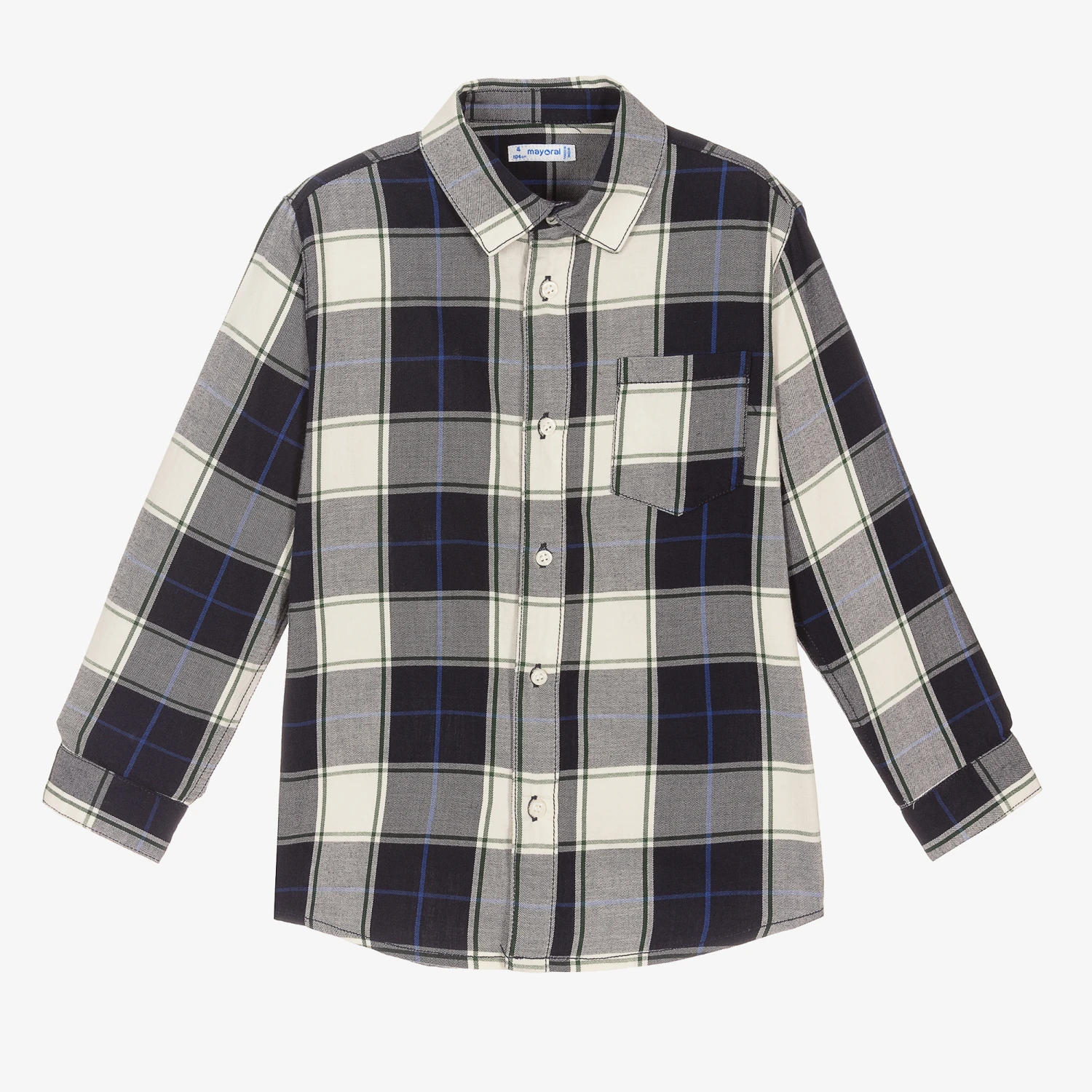Boys navy blue checked shirt by Mayoral. Made in soft cotton with a brushed feel, this comfortable design has grey and ivory checks. There are buttons on the front to fasten and a chest pocket. This item contains sustainable cotton.
