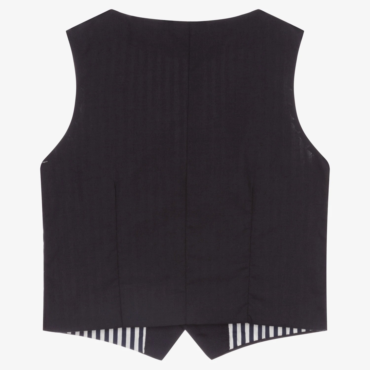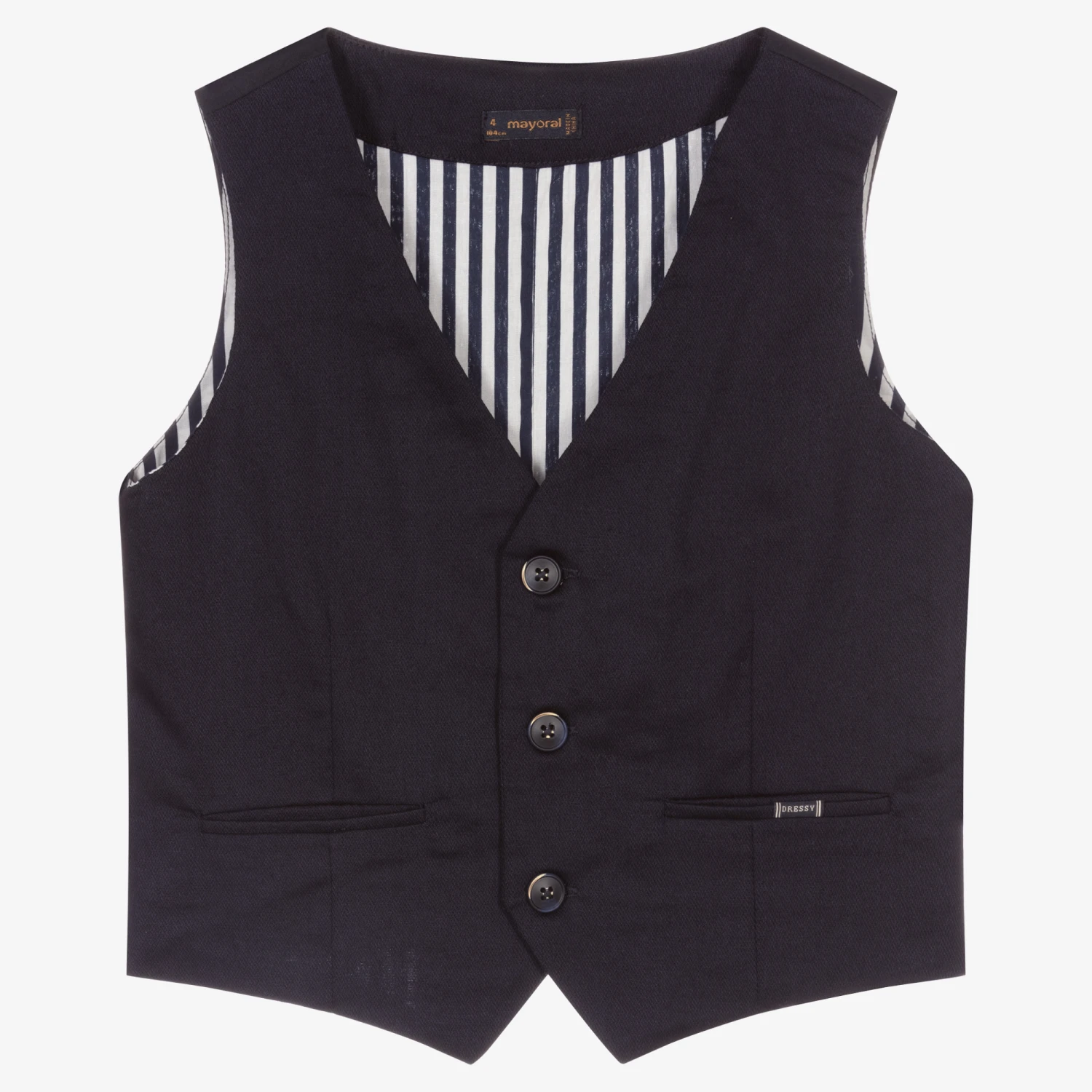 Navy blue waistcoat for boys by Mayoral, made in a soft cotton and linen blend. With a striped lightweight lining, it has button fastenings and pockets on the front.