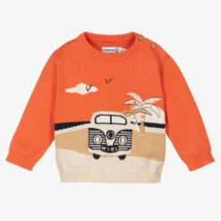 Orange sweater for little boys by Spanish brand Mayoral, knitted in beautifully soft sustainable cotton. Cool and casual, it has an intarsia-knit beach campervan with embroidered palm trees on the front. There are wooden button fastenings on one shoulder to help with over-the-head dressing.