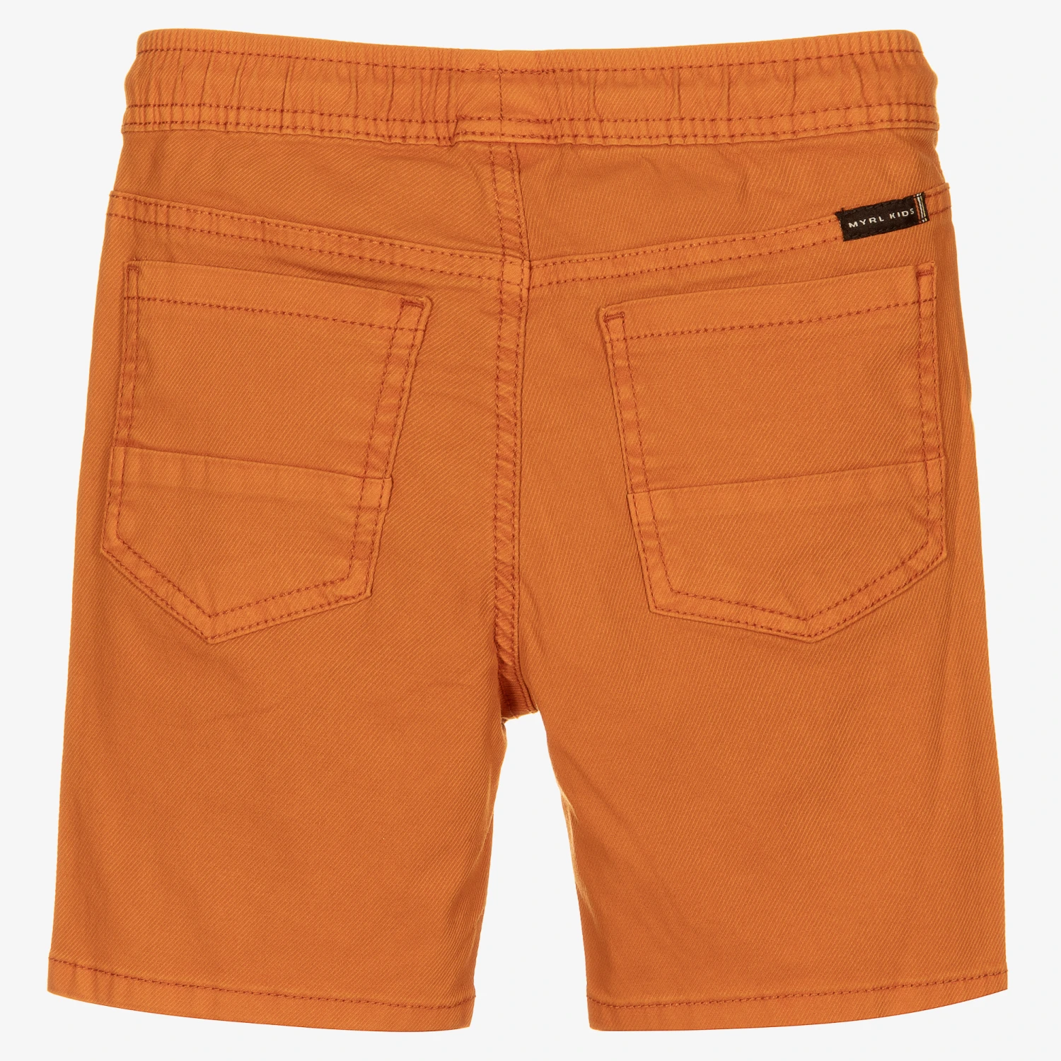 Orange shorts for boys by Mayoral, made in soft cotton twill. They are in a classic five-pocket design and have a drawstring waistband. They have colourful logo embroidery on one hip, with a logo tag on the back.