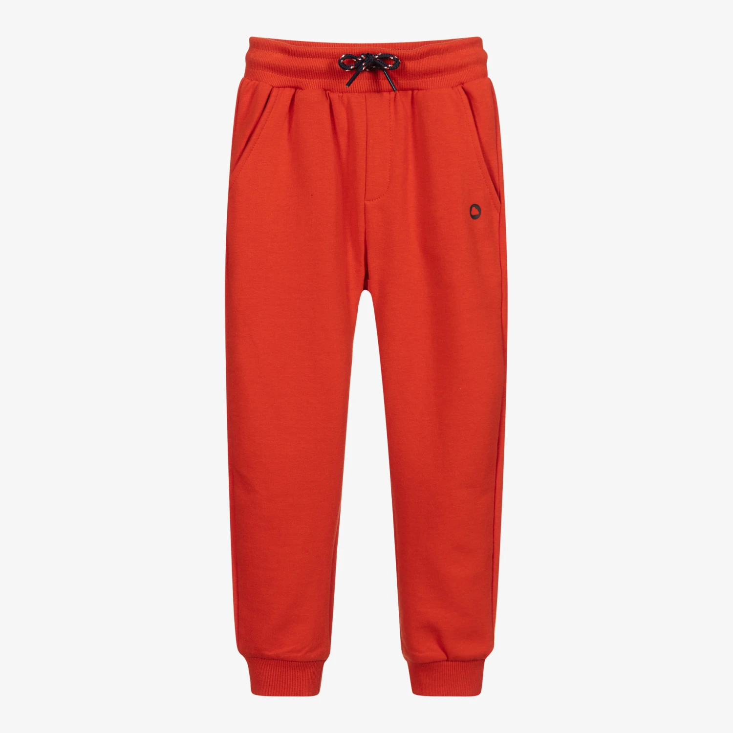 Boys orange joggers from Mayoral, made in mid-weight jersey with a fleecy feel inside. Soft and comfortable, they have a drawstring waistband, three pockets and reinforced knees.