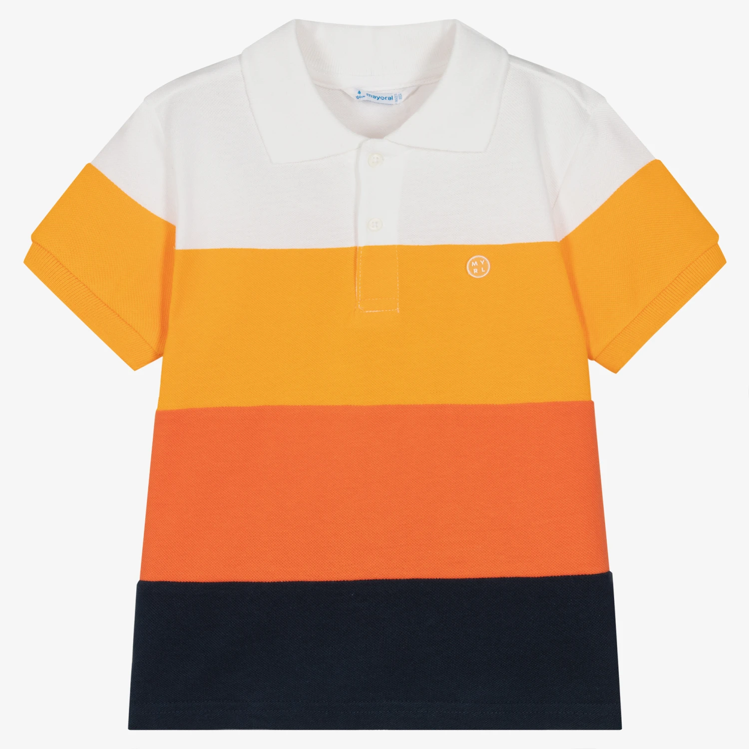 Cotton piqué polo shirt for boys by Spanish brand Mayoral, in wide stripes that graduate from white, orange and to navy blue. Soft and comfortable to wear, it has ribbed collar, branded button fastenings, and a rubberised logo on the chest.