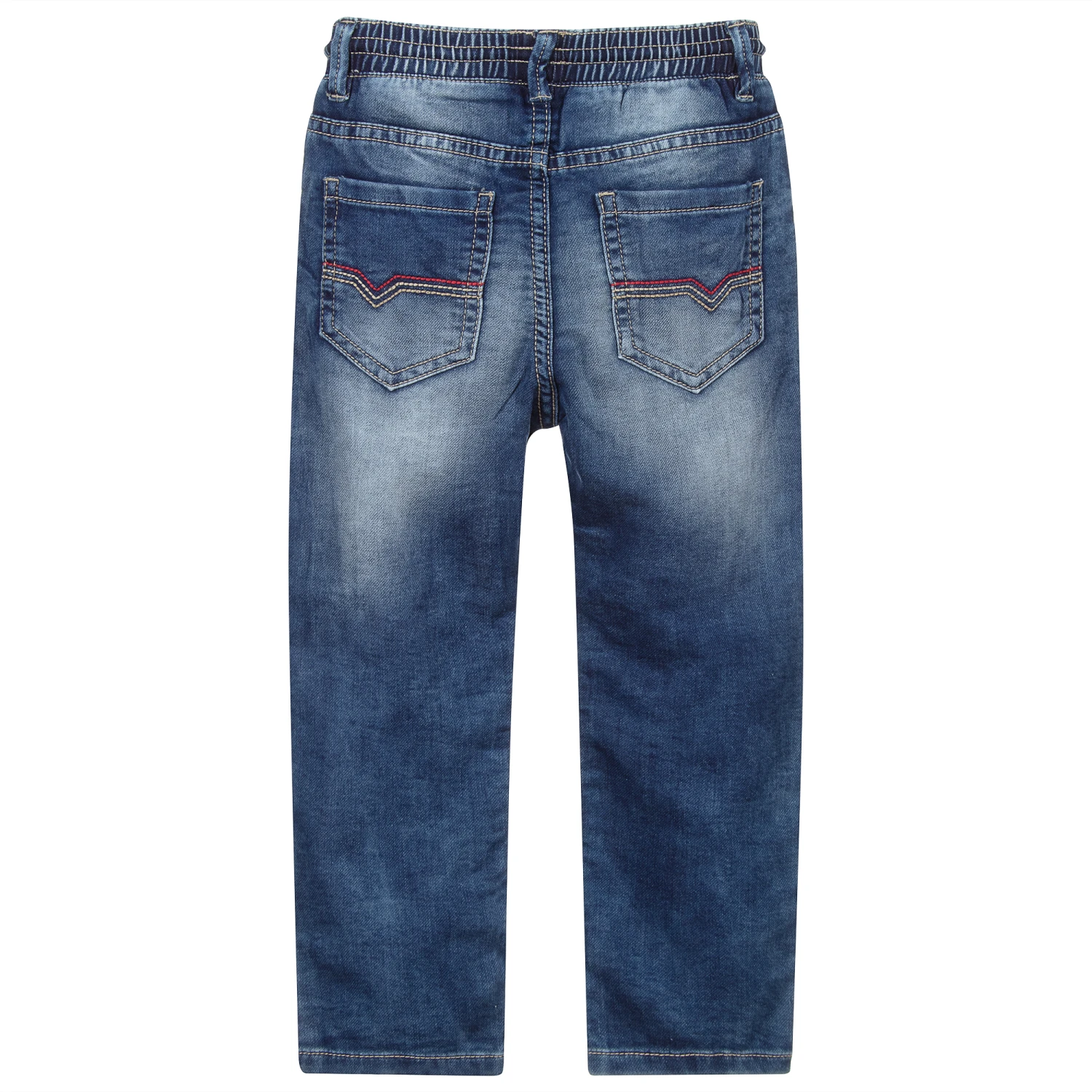 Mid-blue jeans for boys by Mayoral, made in soft, stretch denim, with faded patches on the front and back. With a jogger fit, they have the classic five pocket design and an elasticated, drawstring waist.