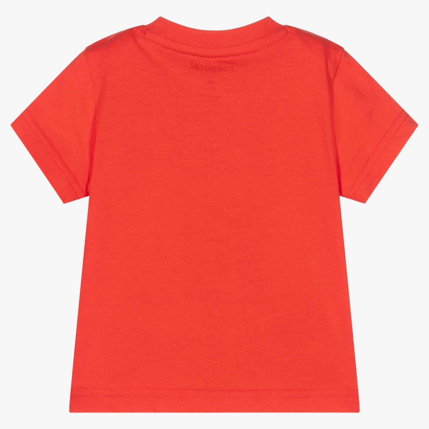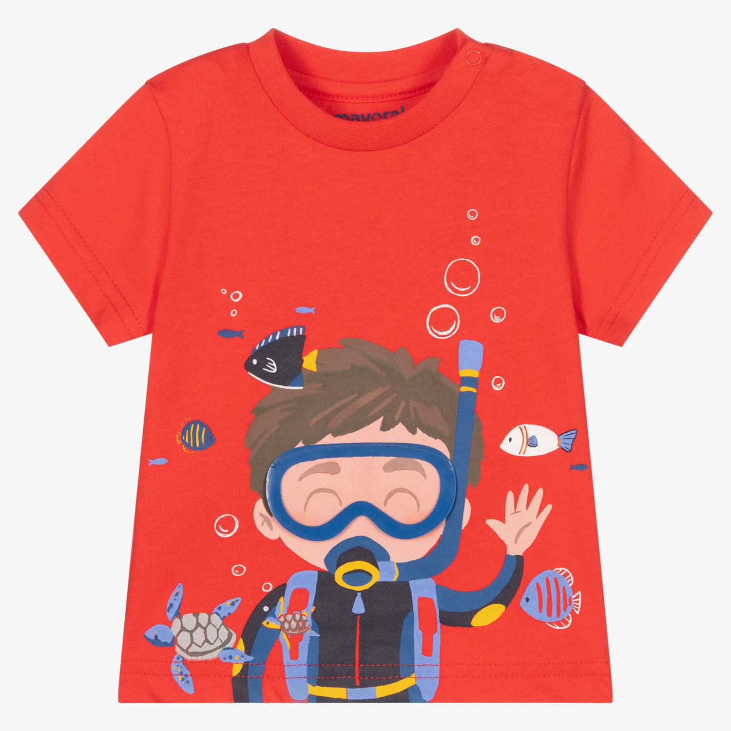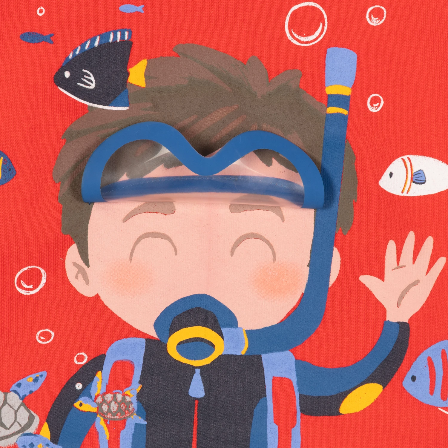 Fun red T-shirt for little boys by Mayoral, made in soft cotton jersey. Fastening with poppers on one shoulder, it has a cute blue scuba diving boy print on the front with an interactive goggle flap.