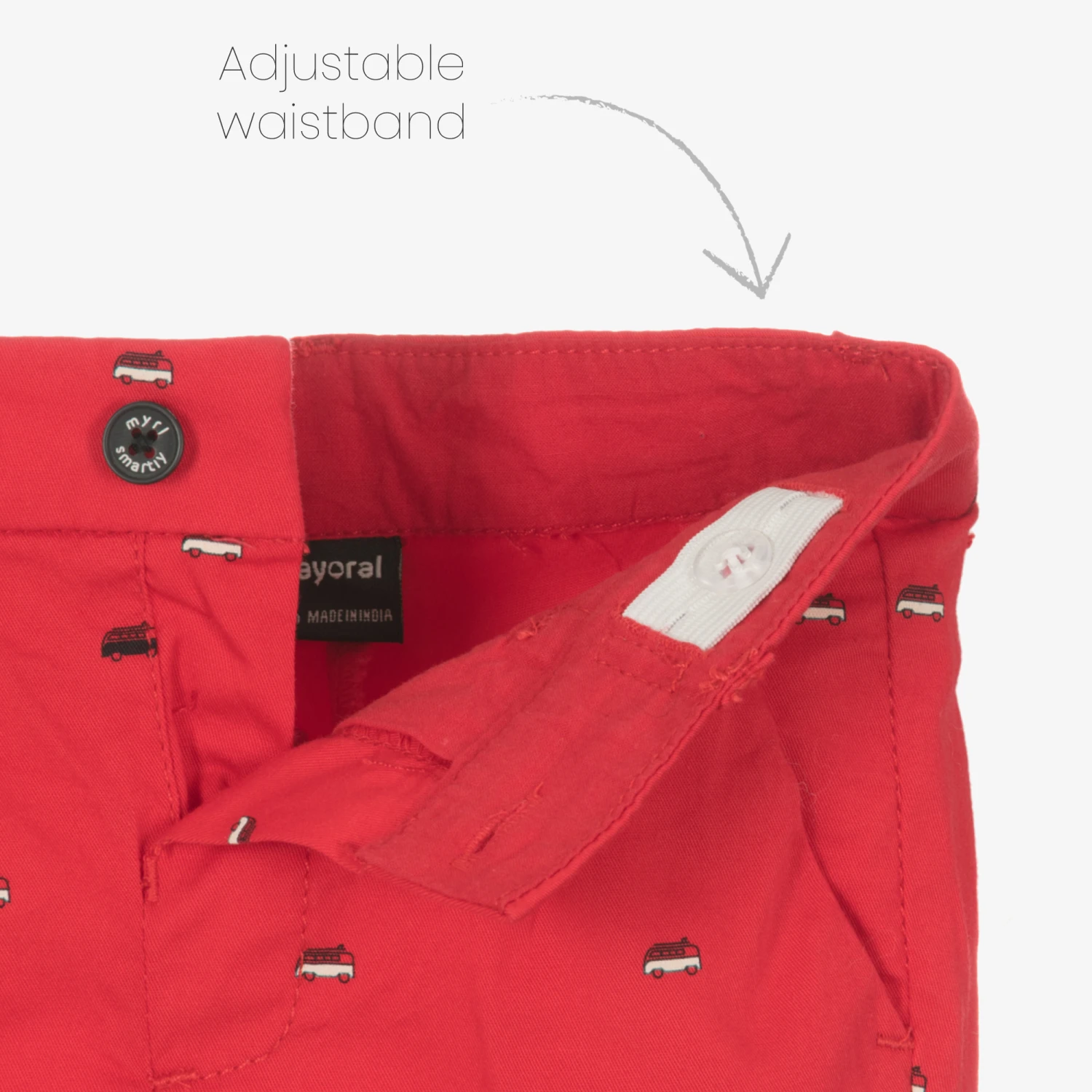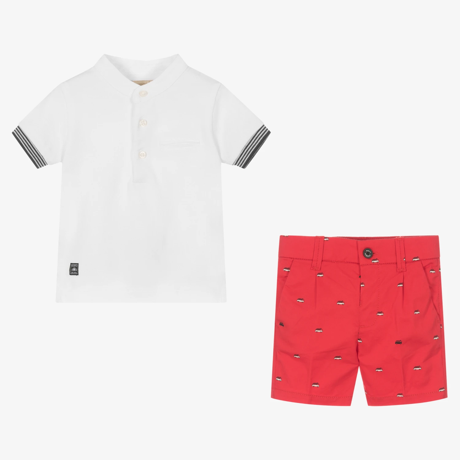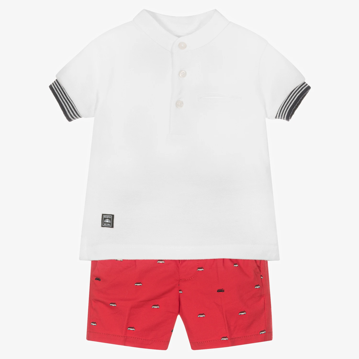 Sweet shorts set for little boys by Spanish brand Mayoral, made in comfortable cotton. The white collarless T-shirt is made in stretchy piqué, with ribbed cuffs striped in navy blue, a faux chest pocket and front button fastenings. The red twill chino shorts have an all-over camper van print and an adjustable waist with a button fastening for a great fit. They have jetted front pockets and a back pocket.