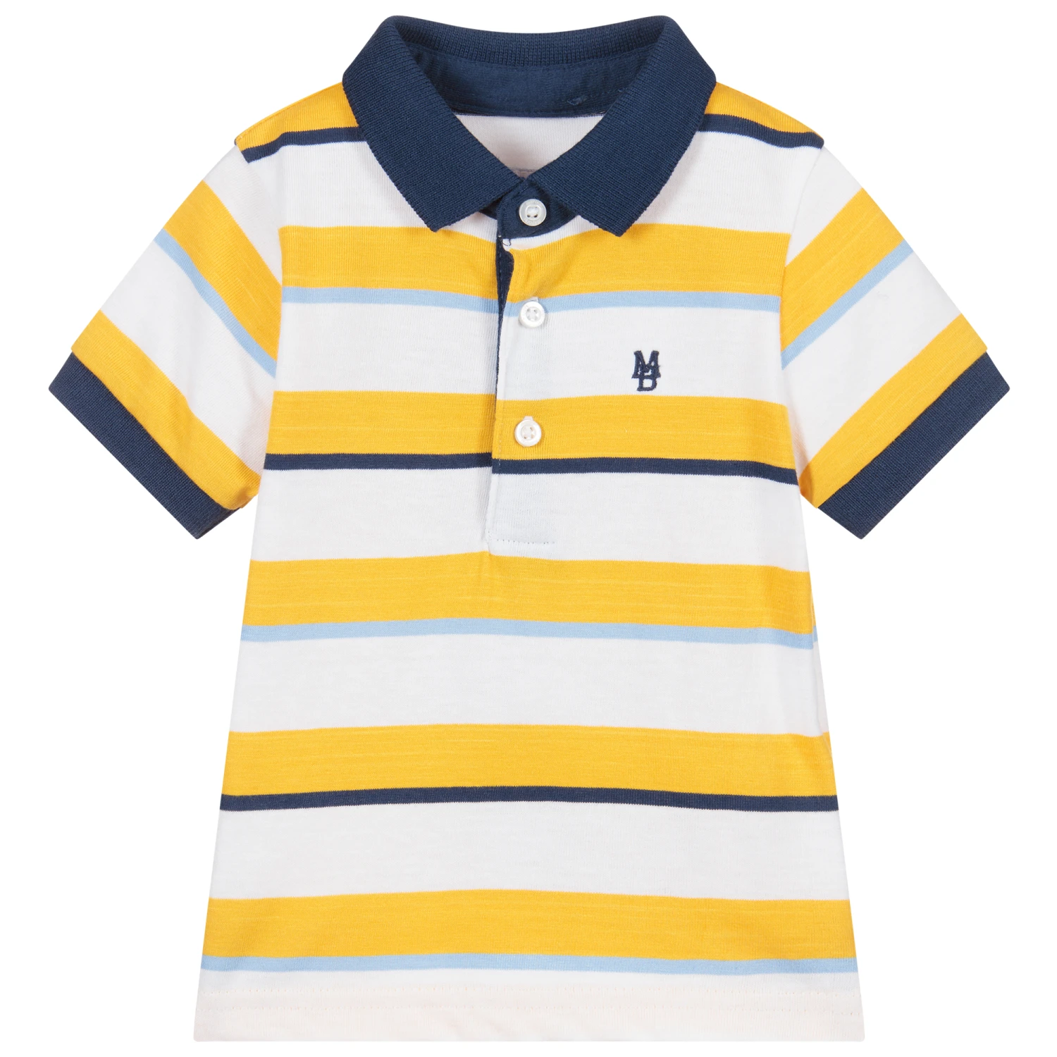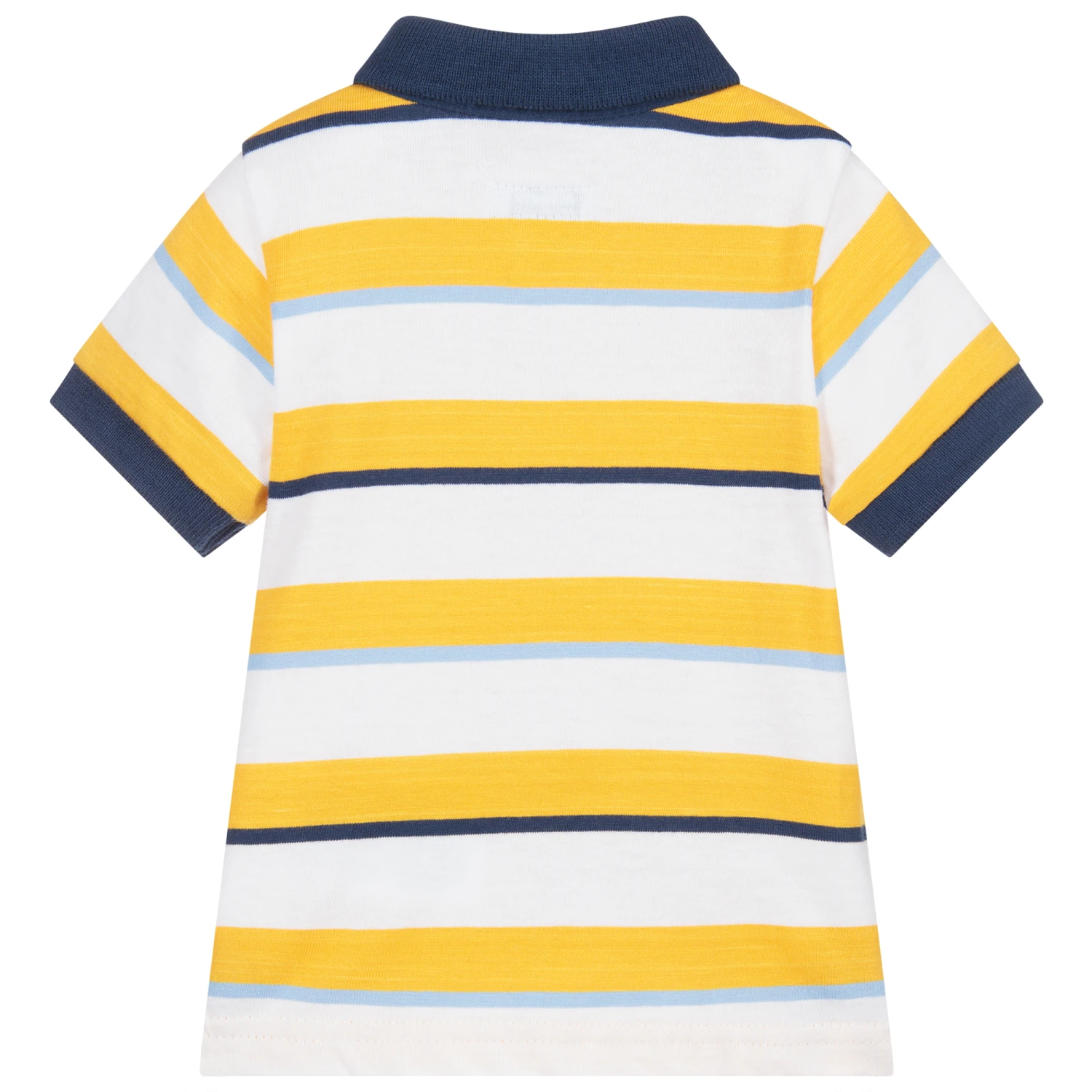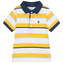 Yellow, blue and white striped polo shirt for little boys by Mayoral, made in soft and stretchy cotton jersey. It has a navy blue ribbed collar and cuffs, with a navy blue embroidered logo on the chest.