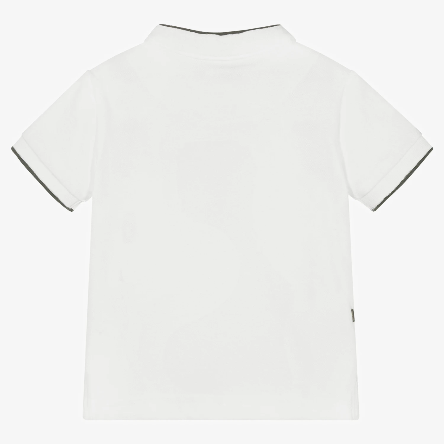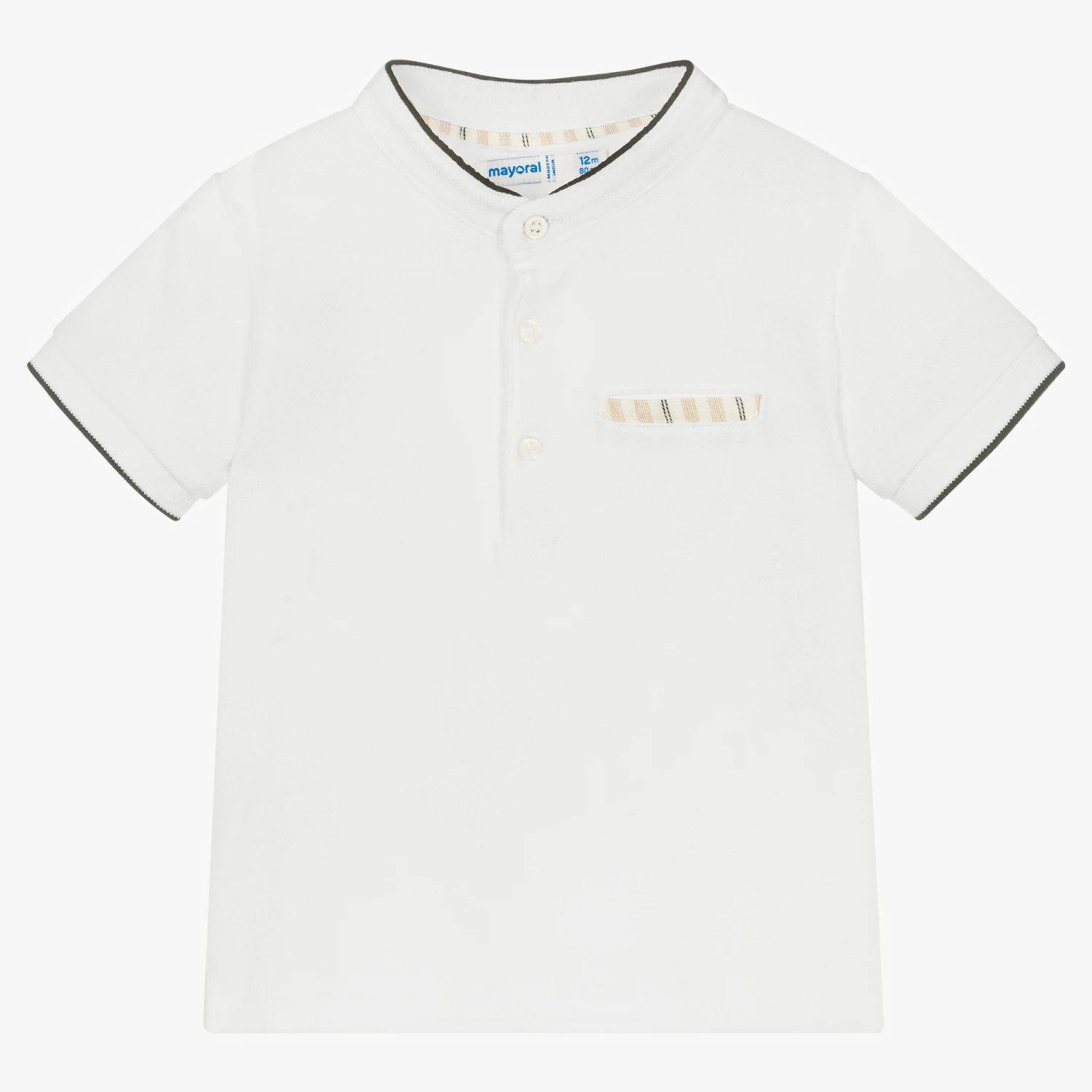 White cotton top for little boys by Spanish brand Mayoral, made in comfortable piqué. Collarless, it has black tipping, front button fastenings and a beige stripe trim on the faux chest pocket. Side vents allow for extra movement.