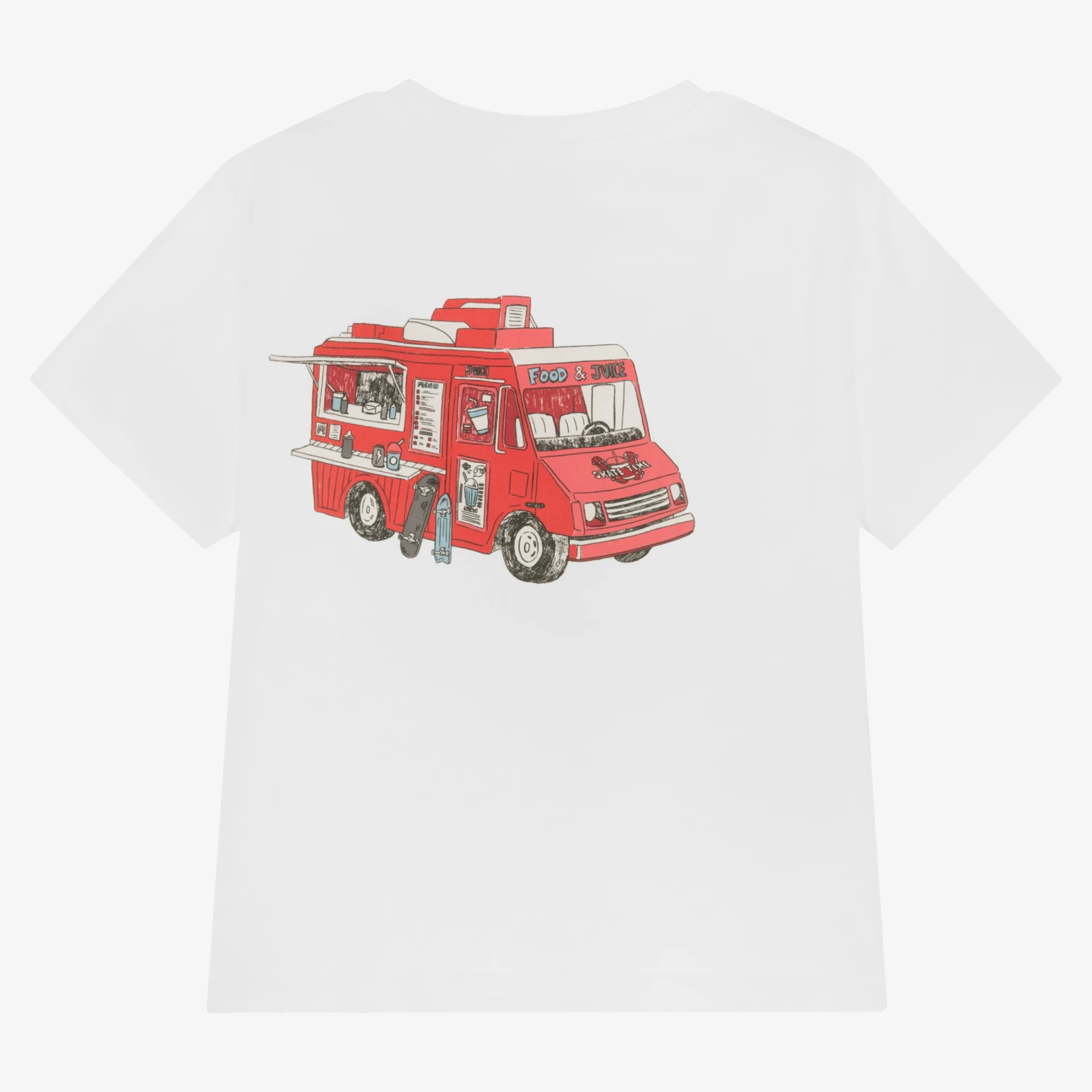 White sustainable cotton T-shirt for boys by Spanish brand Mayoral, with a skate-themed print on the front and back. It is made in comfortable jersey, ideal for relaxed days.