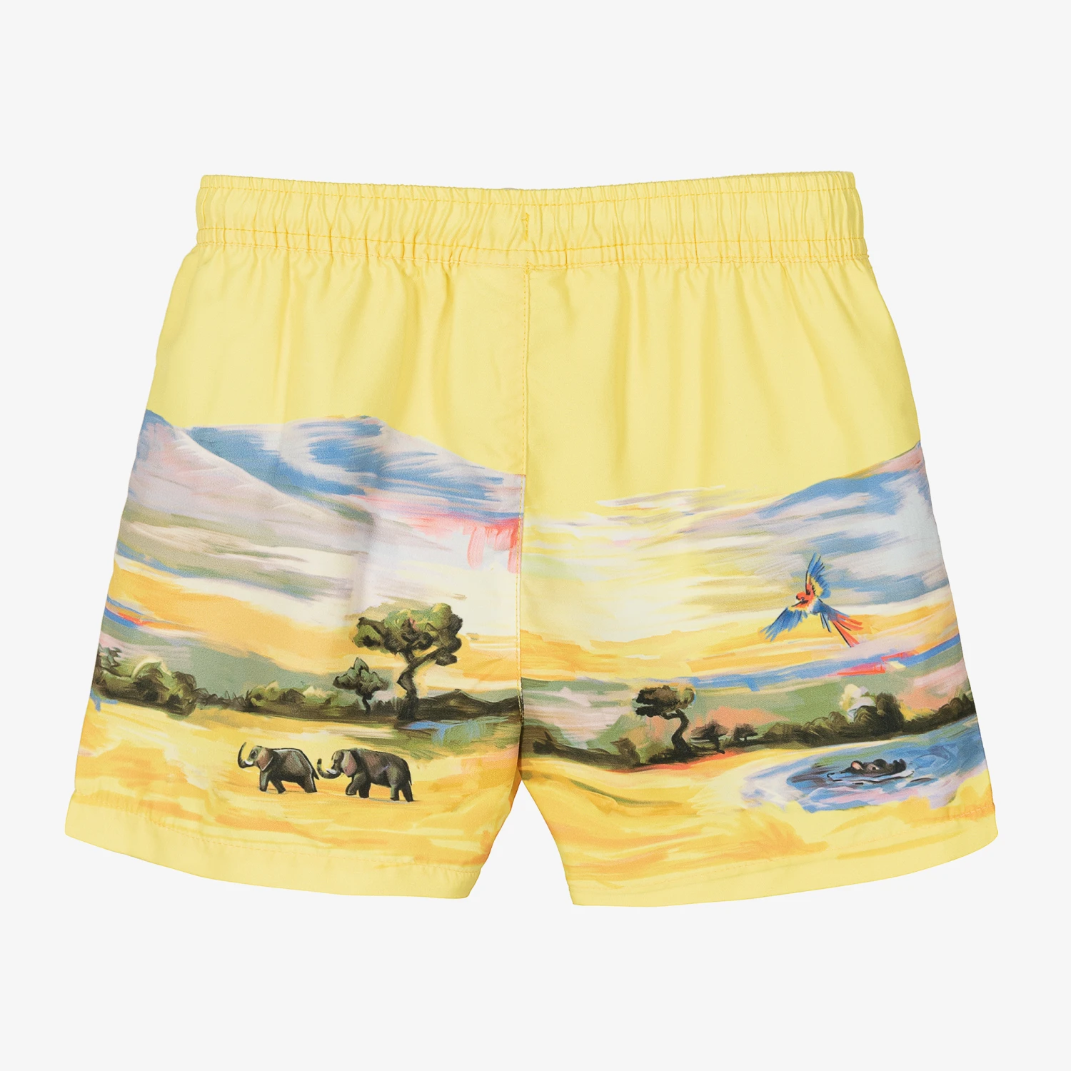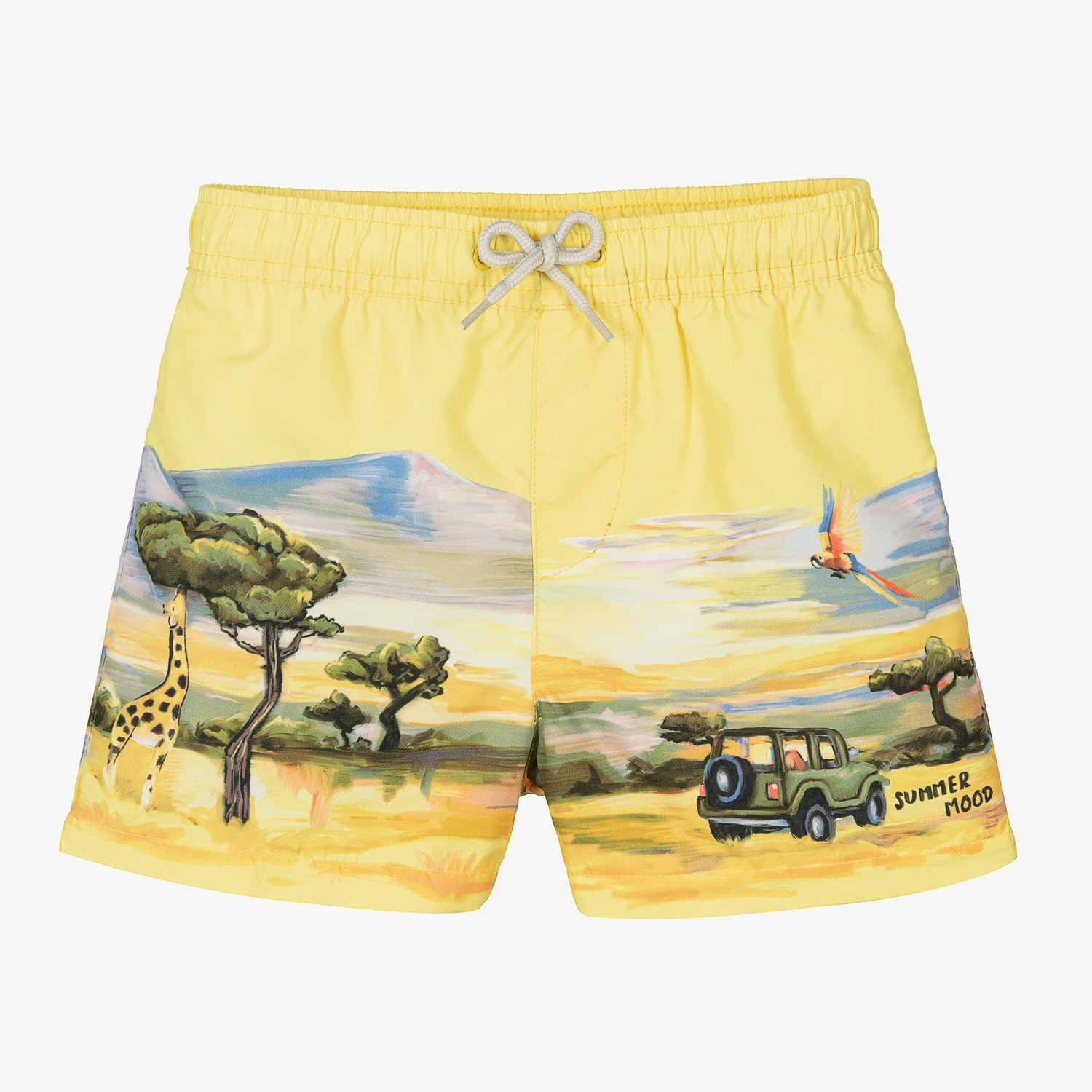 From Mayoral, these bold yellow swim shorts for boys are made in super lightweight fabric. With a mesh pants lining, these functional and comfortable shorts have an elasticated drawstring waist for a superior fit. There is an all-over safari print in tonal shades of green and blue, offering an adventurous look. This item contains recycled fibres.