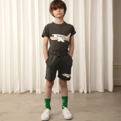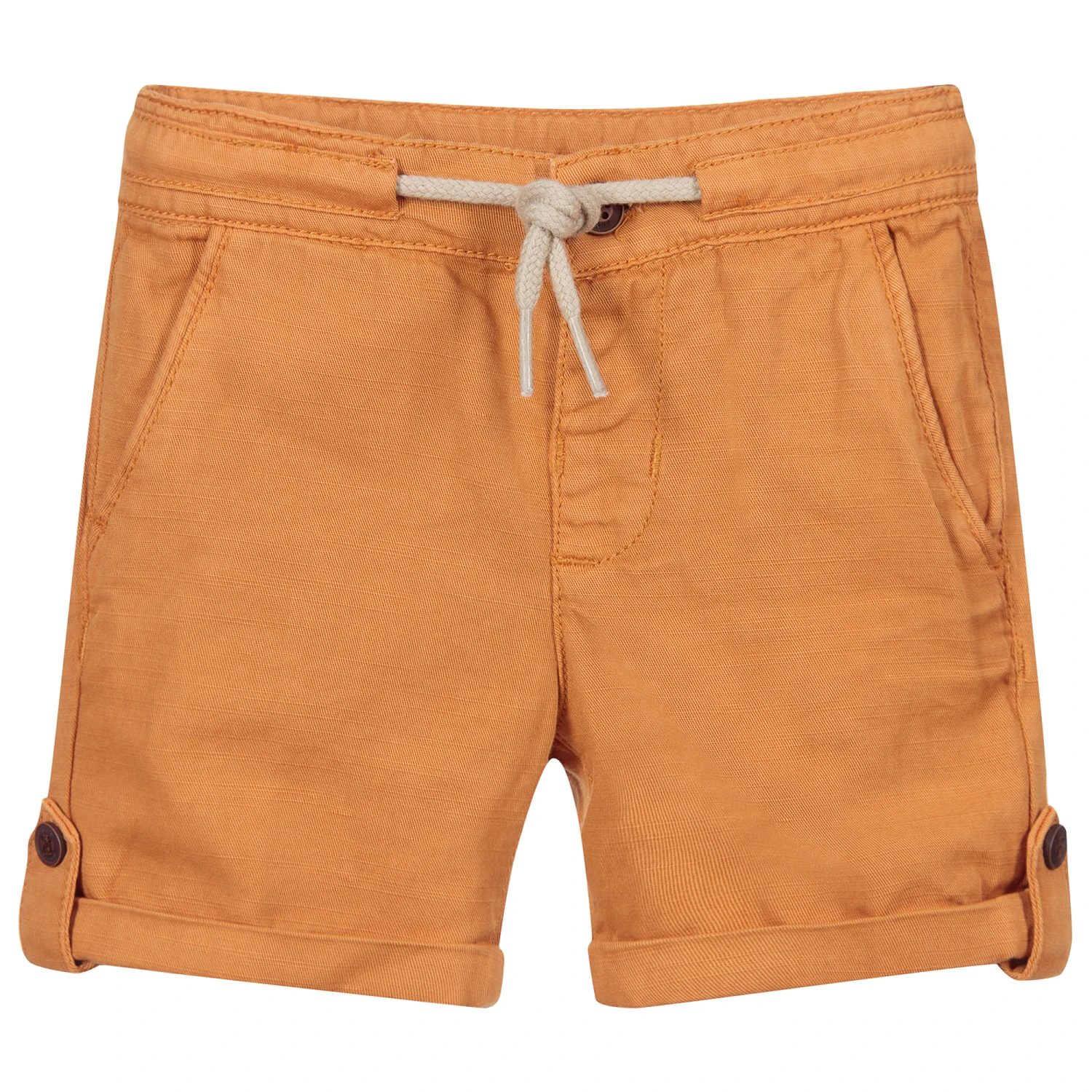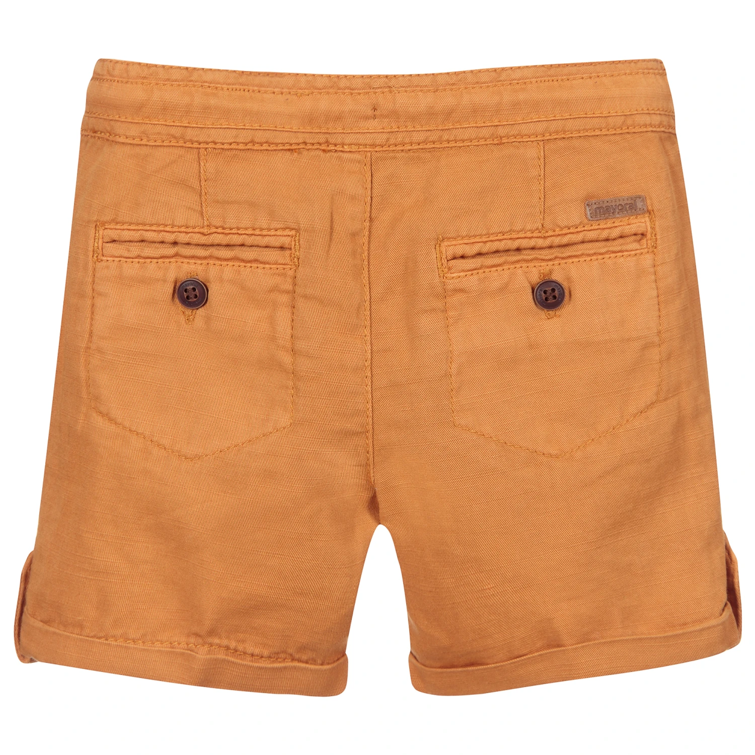 Younger boys ginger brown shorts by Mayoral, made in a soft cotton and linen blend with a washed look. They have an adjustable elastic waistband with button fastening and a drawstring tie. There are pockets on the front and back and turn-up hems with button tabs.