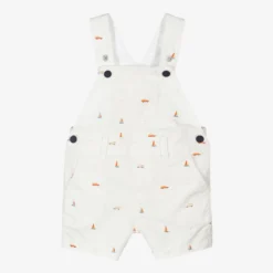 Ivory dungaree shorts for little boys by Mayoral, with a colourful car and sailboat print. Made in soft cotton twill, they have patch pockets and side pockets There are popper fastenings on the sides and straps, and between the legs.