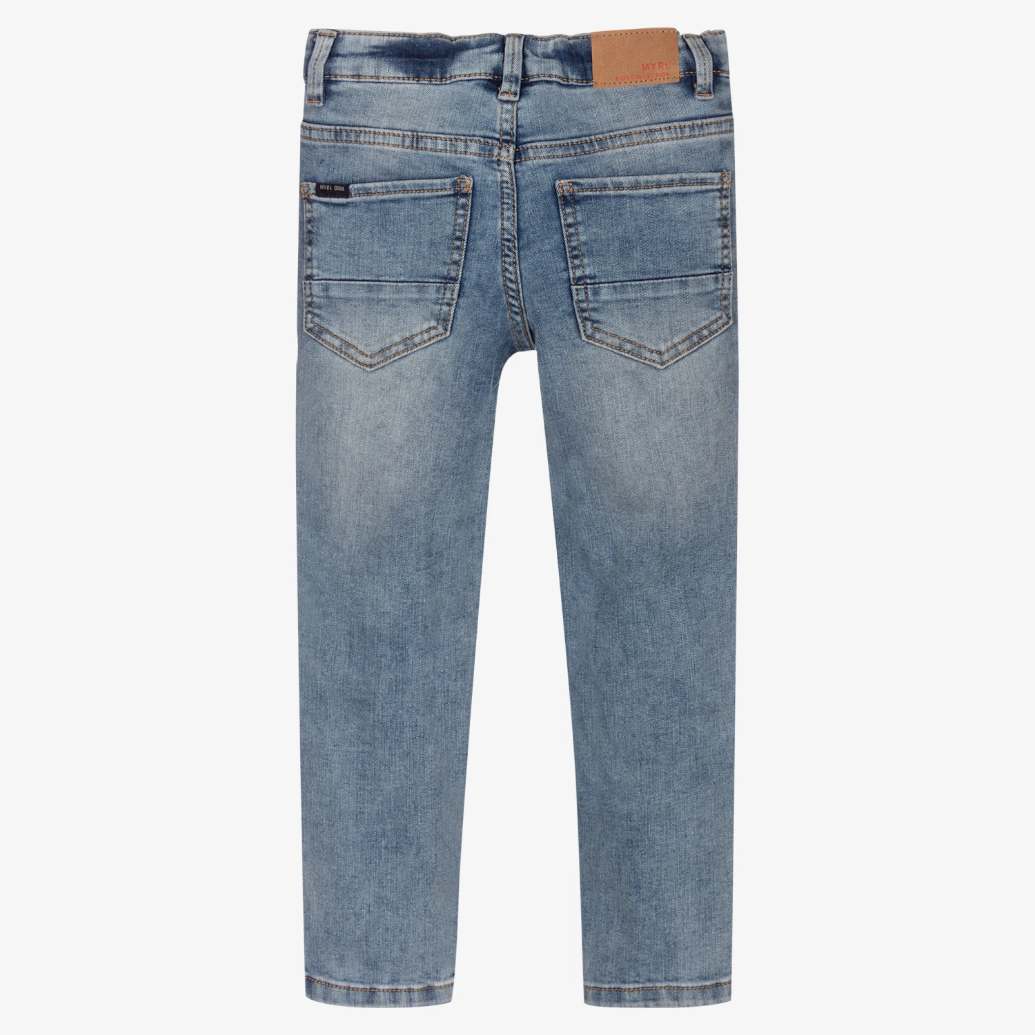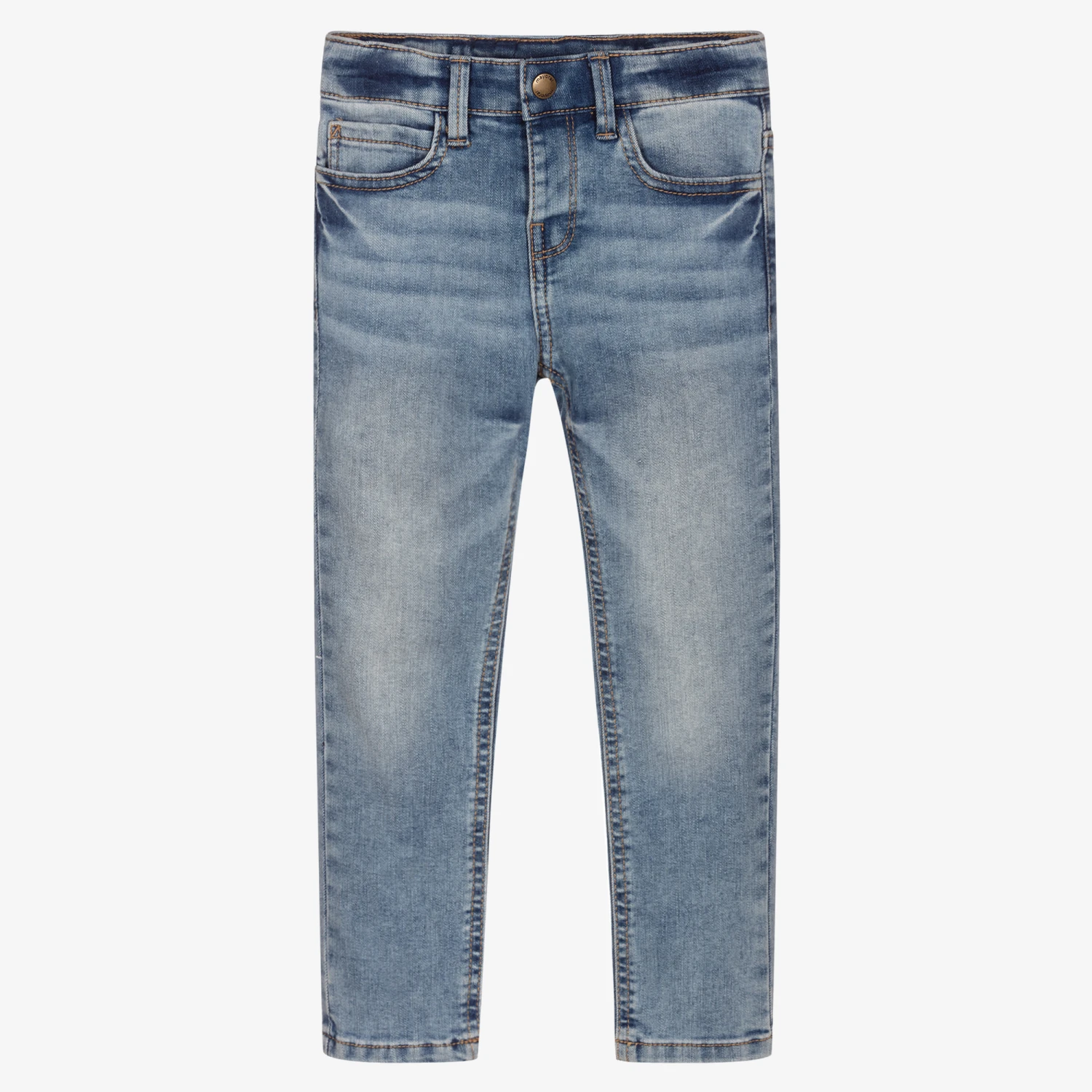 Blue slim fit jeans for boys by Mayoral, with a washed and worn look. Made in soft and stretchy denim, they have classic five pocket styling and branded patches on the back. The waistband is adjustable for a comfortable fit.