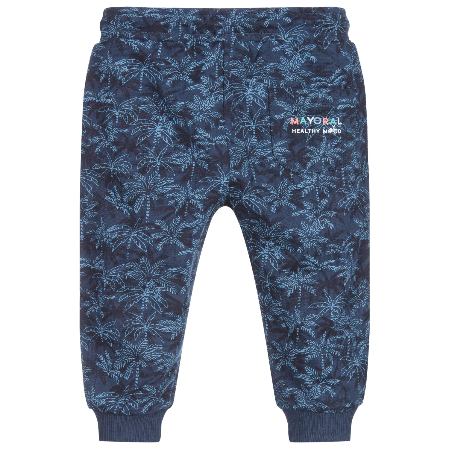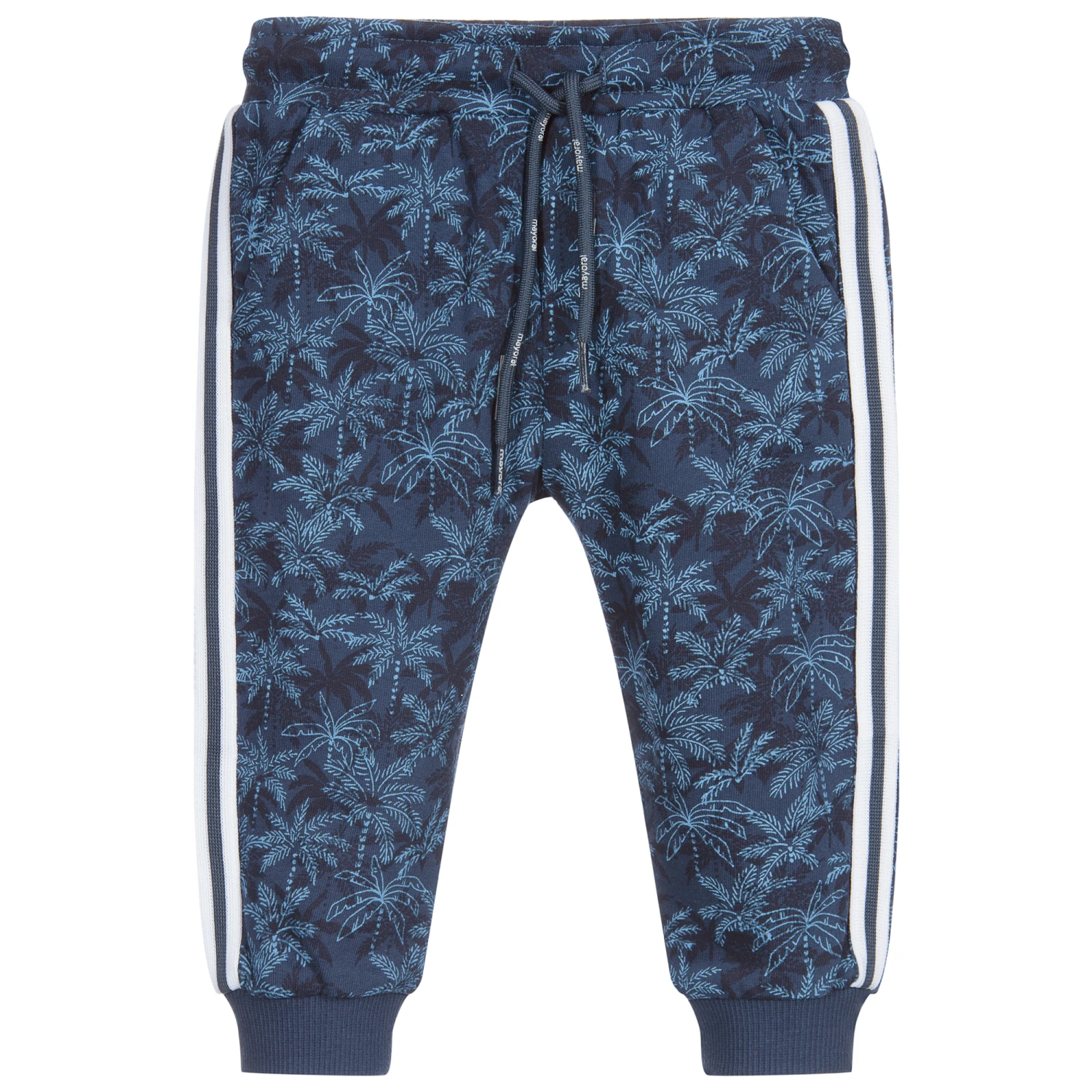Navy blue joggers for little boys by Mayoral, made in soft cotton jersey, with a dark blue and pale blue palm tree print. They have navy blue and white striped trims on each leg, a drawstring waist and a colourful logo print on the back pocket.