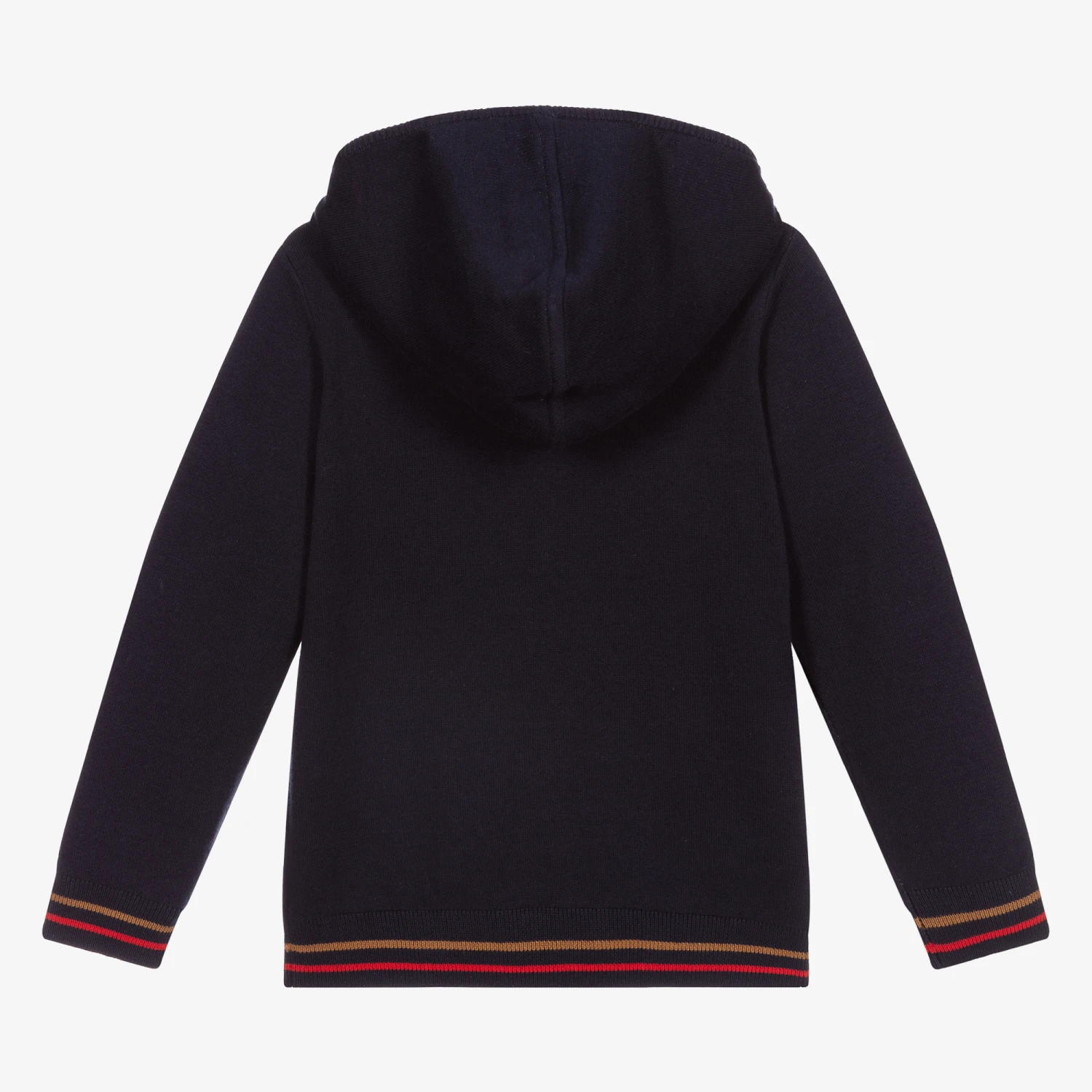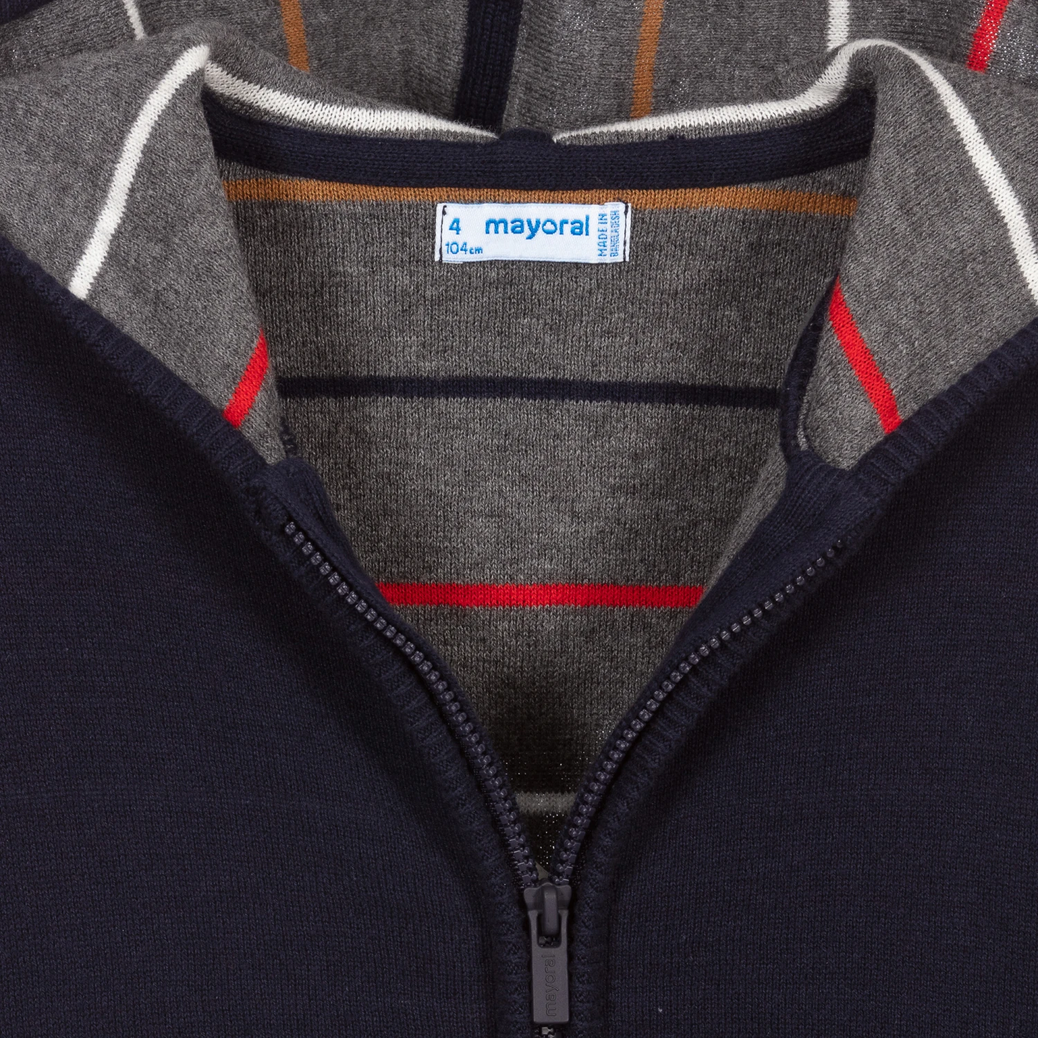 Boys navy blue soft organic cotton knit zip-up hoodie by Mayoral. It has red and tan brown trims, two front pockets and a grey striped lining.