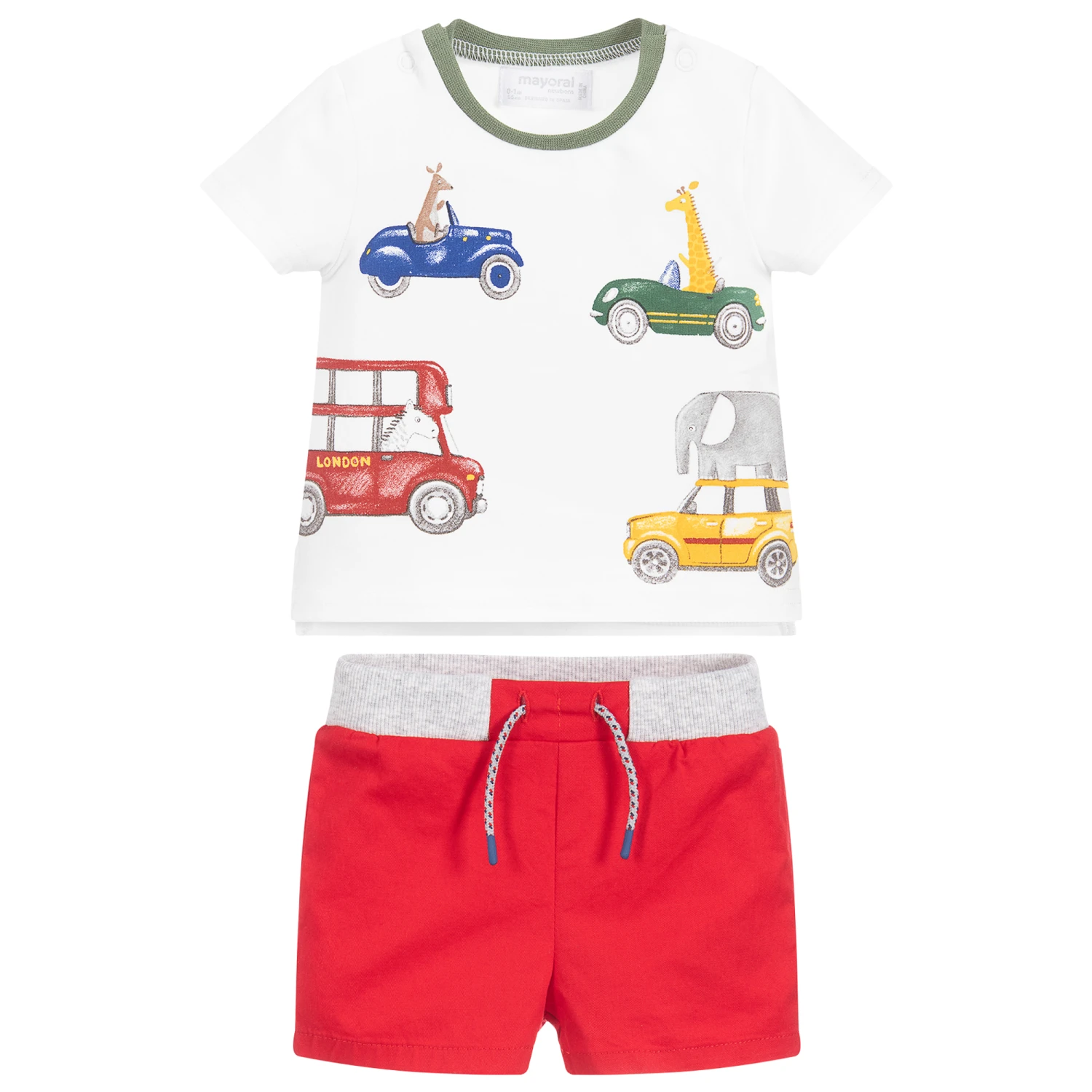 Red and white T-shirt and shorts set for baby boys and girls by Mayoral, with a fun animal and vehicle print. The jersey T-shirt has poppers on the shoulders, and the red shorts have a grey ribbed waistband with a faux drawstring.