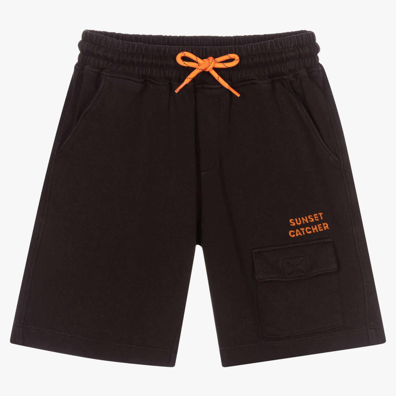 Black shorts for boys by Mayoral Nukutavake, with a washed and faded look. Made in comfortable cotton sweatshirt jersey, the elasticated waistband has an orange and black striped drawstring. There is a velcro-fastening pocket on one leg, with ‘Sunset Catcher’ embroidered above in orange. Above the back pocket is a ‘Made for Sunsets’ tab.
