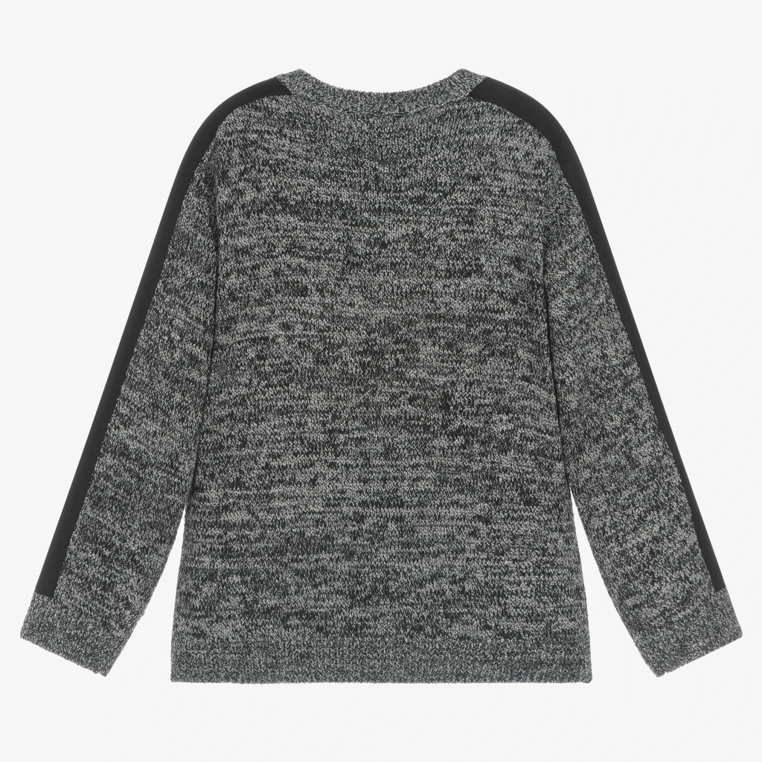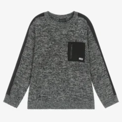 Marl grey sweater for boys by Mayoral Nukutavake, knitted in polyester blend. Classic style with a crew neck, it has nylon panelling on the sleeves and chest pocket for an alternative look. It is soft and comfortable to wear due to a loose fit.
