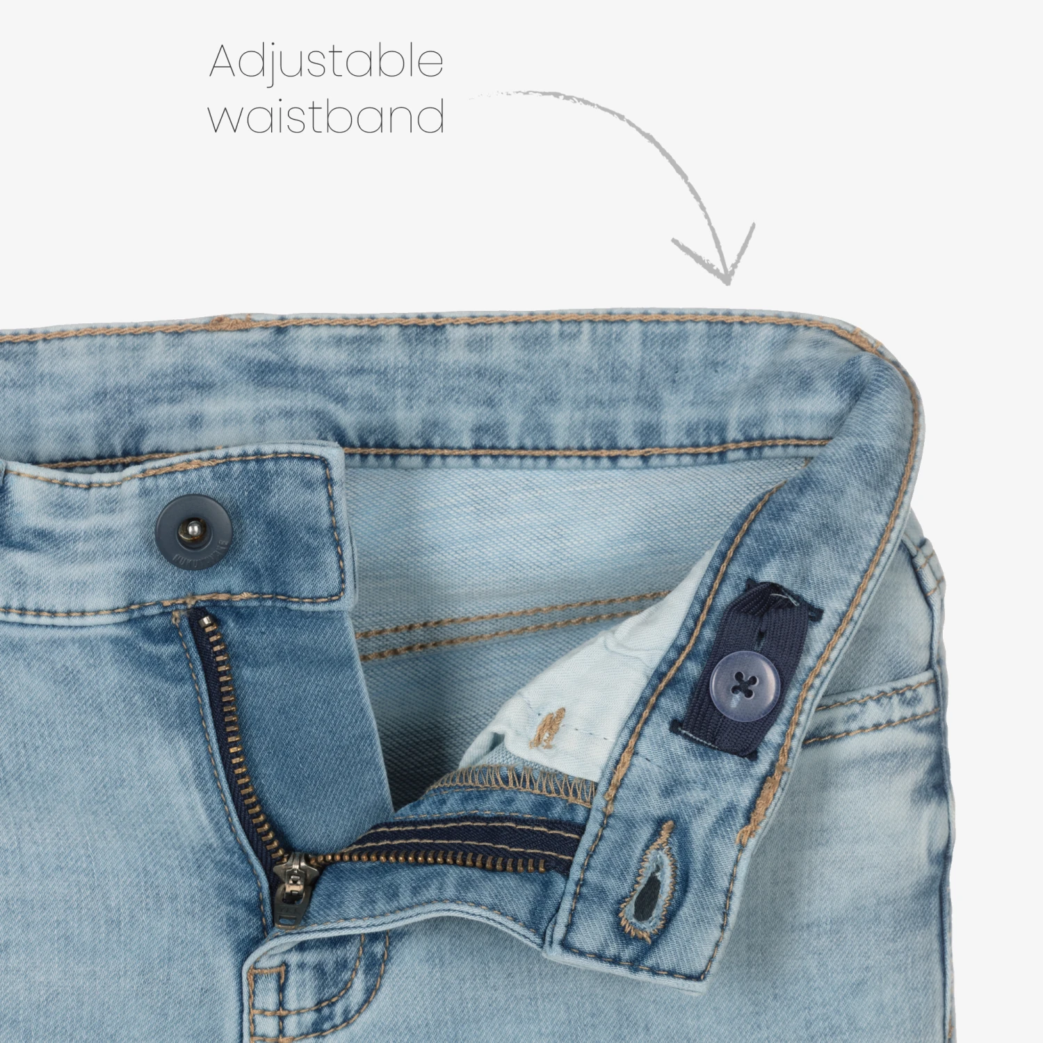 Boys light blue sustainable cotton denim jeans from Mayoral Nukutavake, in a stylish slim fit. Easy to pair with just about anything, these staple washed look jeans come in five pocket style and have a light tan brown logo patch on the back. An adjustable waist allows room to grow, whilst the zip and button fasten easily.