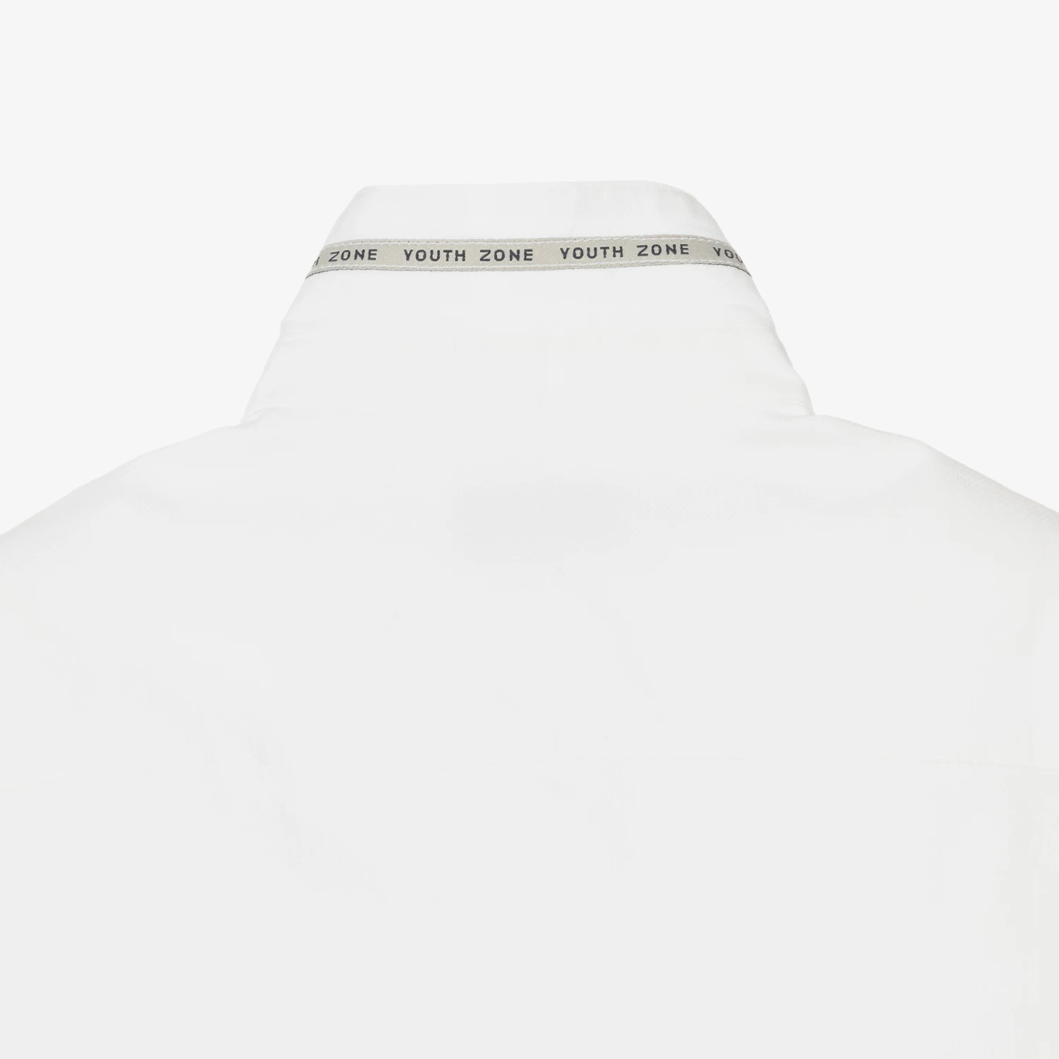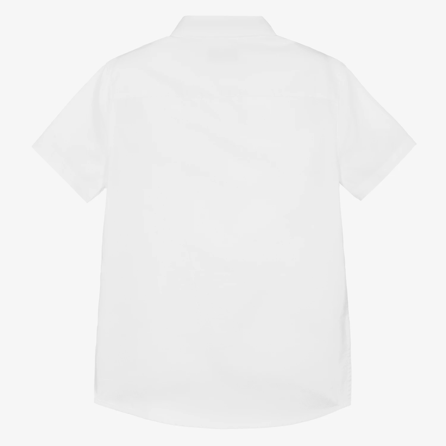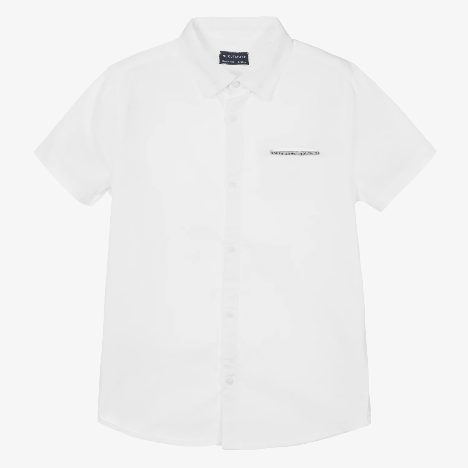 White short-sleeved shirt for boys by Mayoral Nukutavake, made in lightweight sustainable cotton with a fine basketweave. Fastening with branded buttons, it has an embroidered tonal logo and jetted chest pocket. The shirt is trimmed with grey and black ‘youth zone’ ribbon on the pocket, and concealed beneath the collar and button placket.