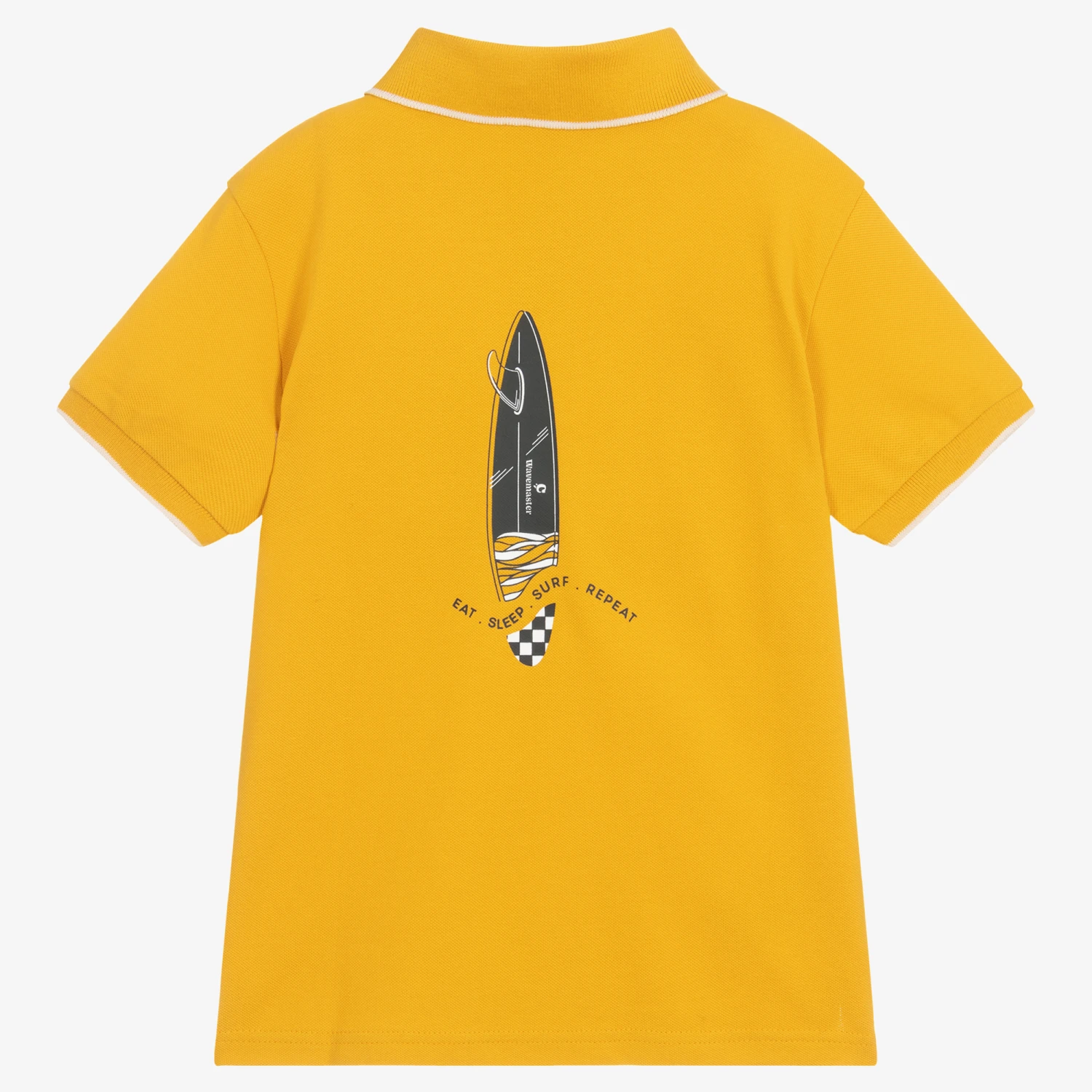 Mustard yellow polo shirt for older boys by Mayoral Nukutavake, made from soft cotton piqué. In a classic style, it has a ribbed collar and cuffs with contrast ivory trims. There is a cool surfboard graphic print on the chest which matches the larger motif and the ‘Eat, Sleep, Surf, Sepeat’ slogan on the back.