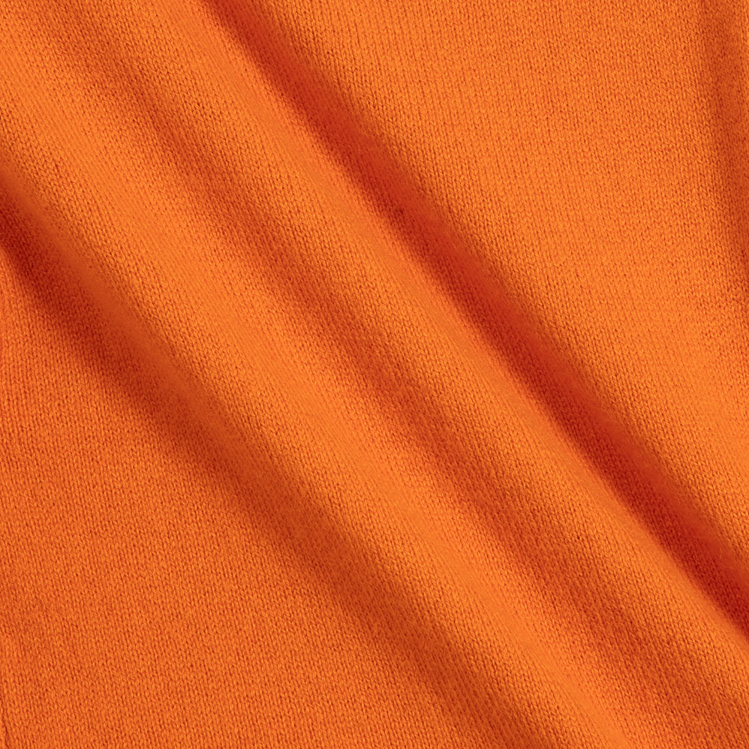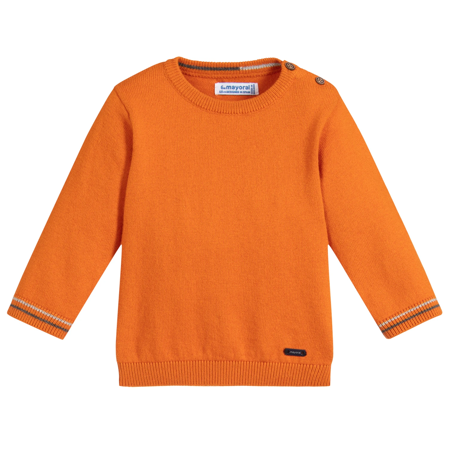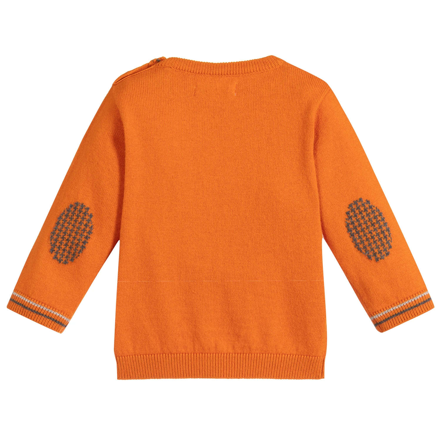 Orange knitted sweater for little boys by Mayoral, made in a soft cotton blend. It has grey stripes on the cuffs and grey stitched faux elbow patches on the sleeves. There are useful button fastenings on one shoulder.