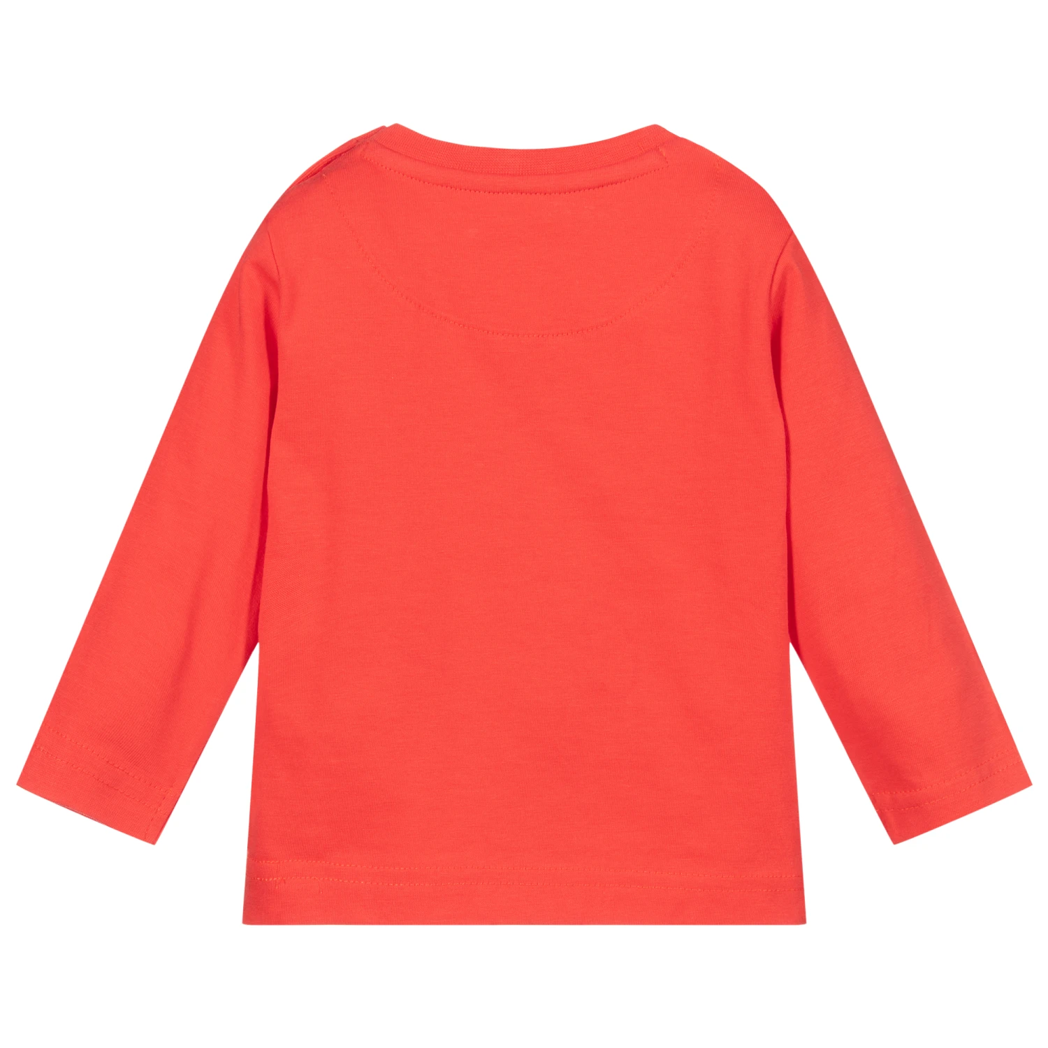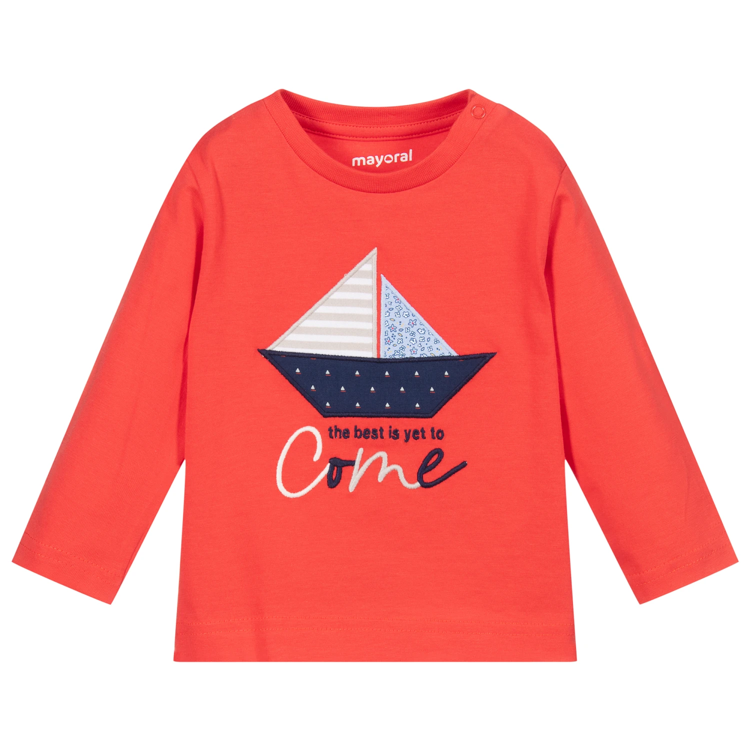 Red long sleeved top for younger boys by Mayoral. Made in soft cotton jersey, it has an appliqué boat design in shades of blue and beige, with the words ‘the best is yet to come’ embroidered below.
