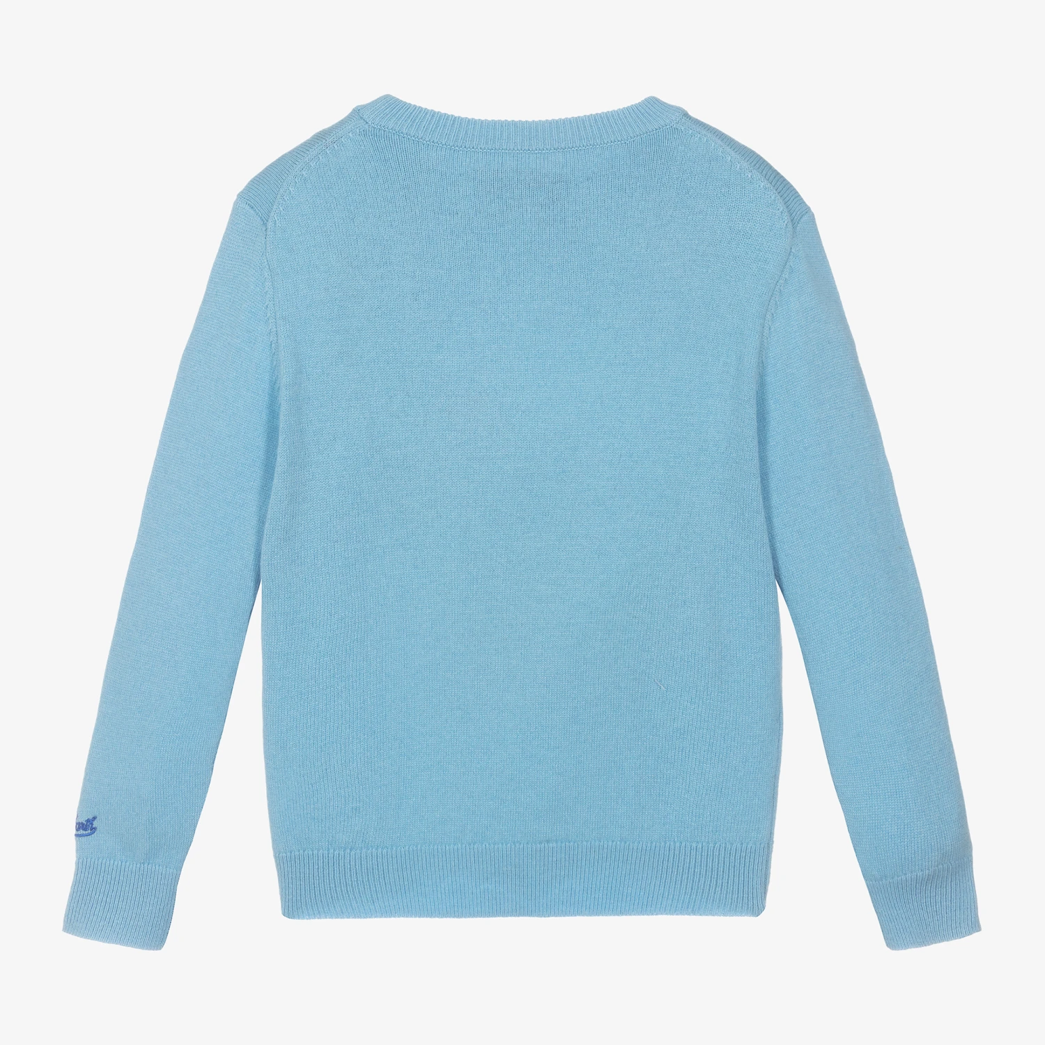 A festive pale blue sweater for boys and girls by MC2 Saint Barth, knitted in a luxury wool blend. Warm and cosy, it has a fun dinosaur and slogan intarsia pattern on the front. It has a classic crew neck and ribbed trims for added comfort.