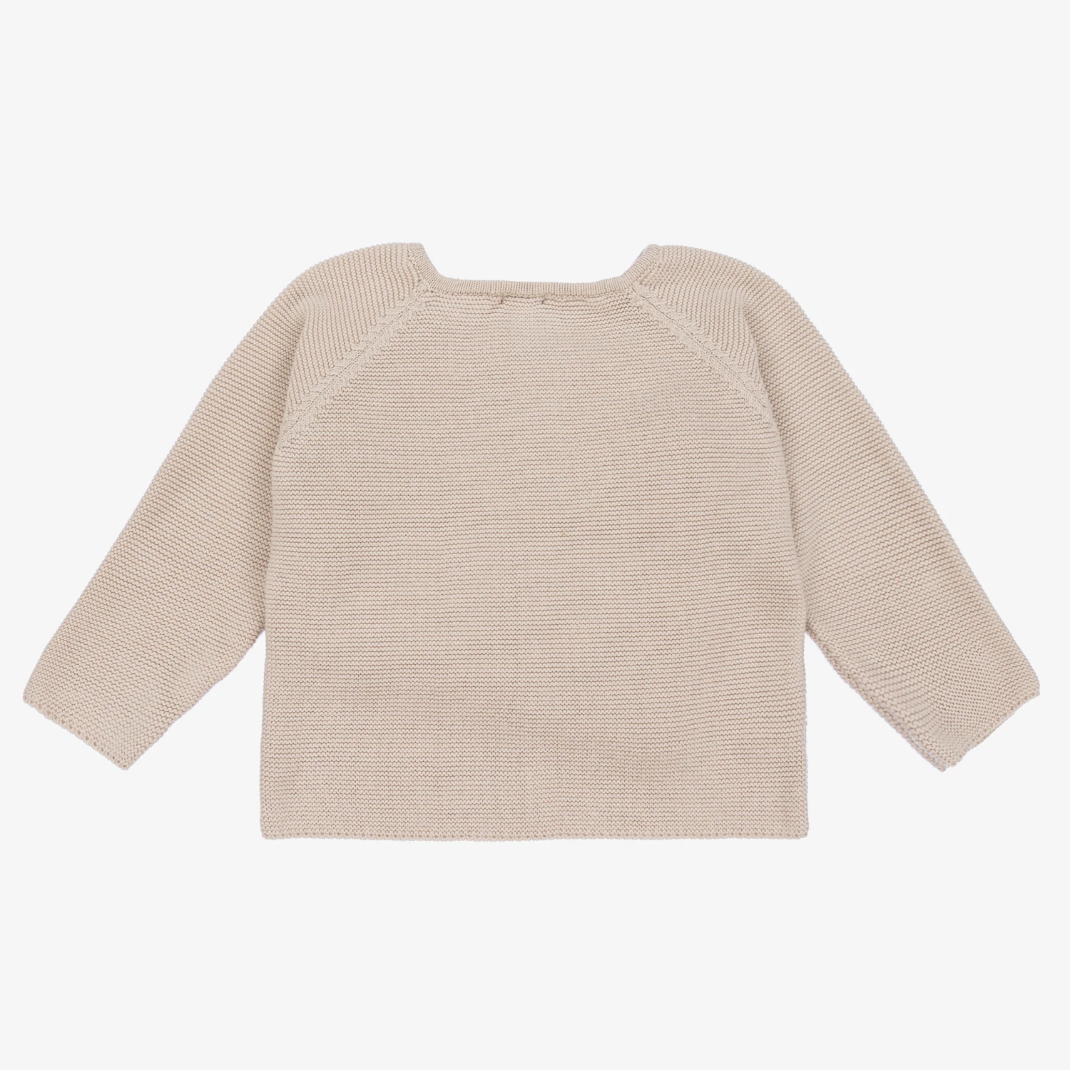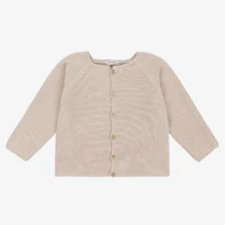 Light beige cardigan for boys and girls by Mebi, finely knitted in beautifully soft cotton. Lovely for layering, it fastens with wooden buttons on the front and has cable knit trims. Mebi is a very small fitting brand, please choose a size up to allow room to grow.