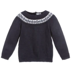 Little boys navy blue sweater by Mebi, made in softly knitted acrylic. Lightweight, it has a white and beige pattern around the neckline and mother-of-pearl button fastening on the back of the neck.
