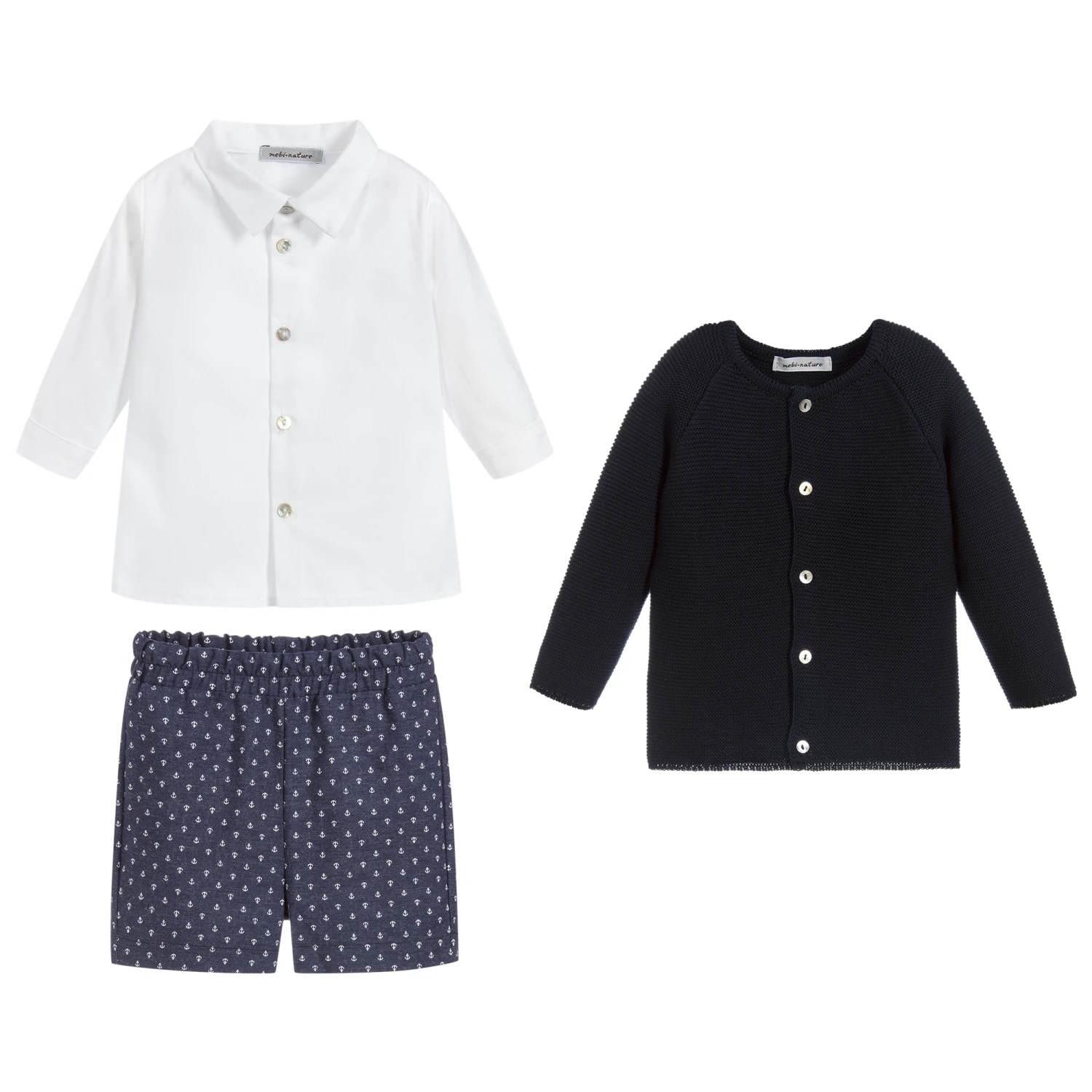 Stylish cotton outfit for little boys by Mebi, comprising of shorts, a shirt and a cardigan. The blue, lightweight shorts are decorated with a white anchor print, and have an elasticated waist. The mid-weight white shirt has smart mother of pearl buttons, and the navy blue cardigan is finely, softly knit.