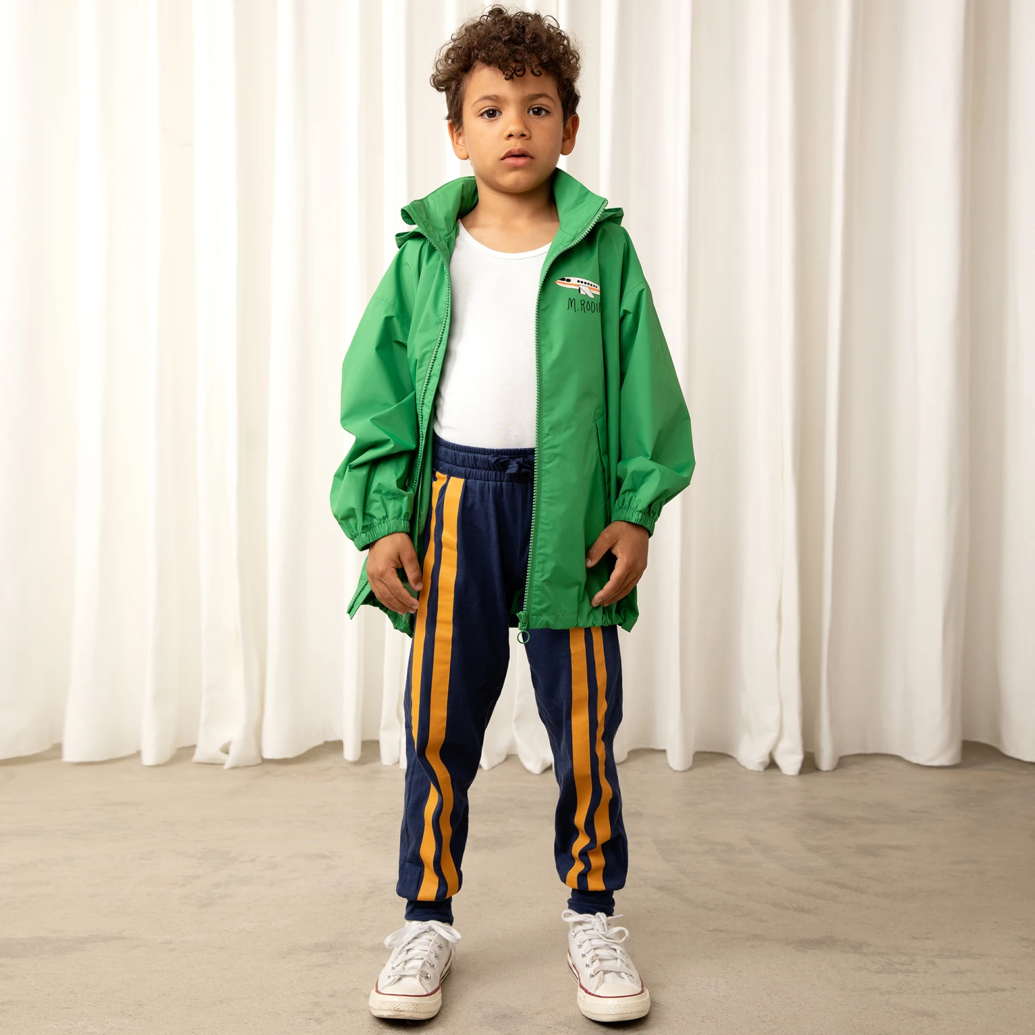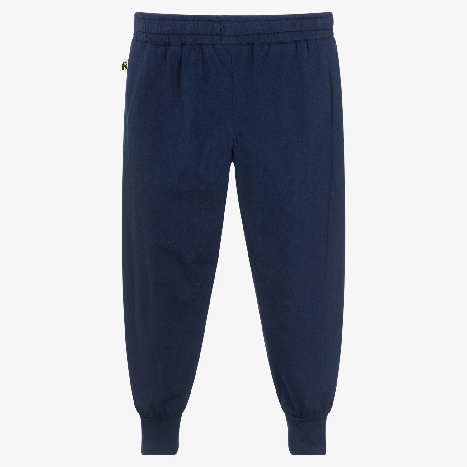 Navy blue joggers for boys by Mini Rodini, made in lightweight organic cotton jersey. Comfortable to wear, they have bold yellow stripes on each leg, a useful drawstring waist and the brand’s small panther logo tab on one side.
