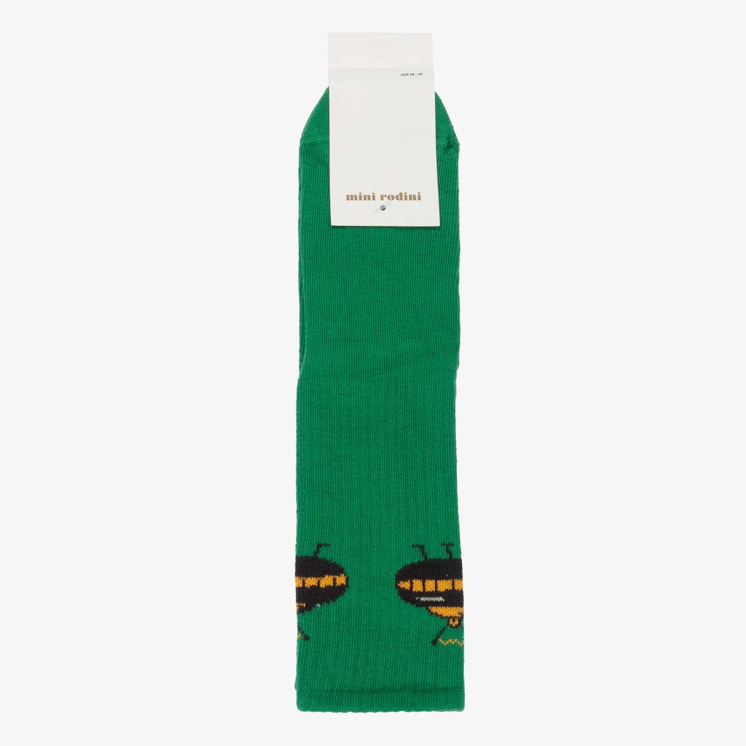 Fun green socks for boys and girls by Mini Rodini, with black and yellow UFO motif. They are made in soft ribbed organic cotton with rubberised white anti-slip dots and logo print on the soles for good grip.