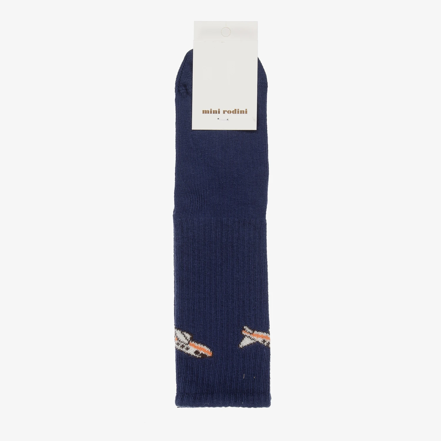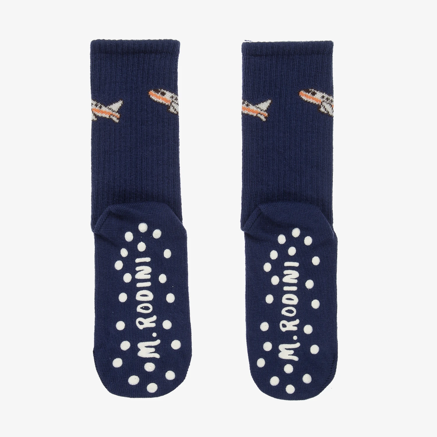 Navy blue socks for boys and girls by Mini Rodini, made in soft and stretchy organic cotton. Easy to wear, these comfortable ankle socks have ribbed legs with fun white and orange aeroplane motifs on the sides. A bold white logo design can be seen on the sole of the foot, along with rubberised anti-slip pads for extra grip.
