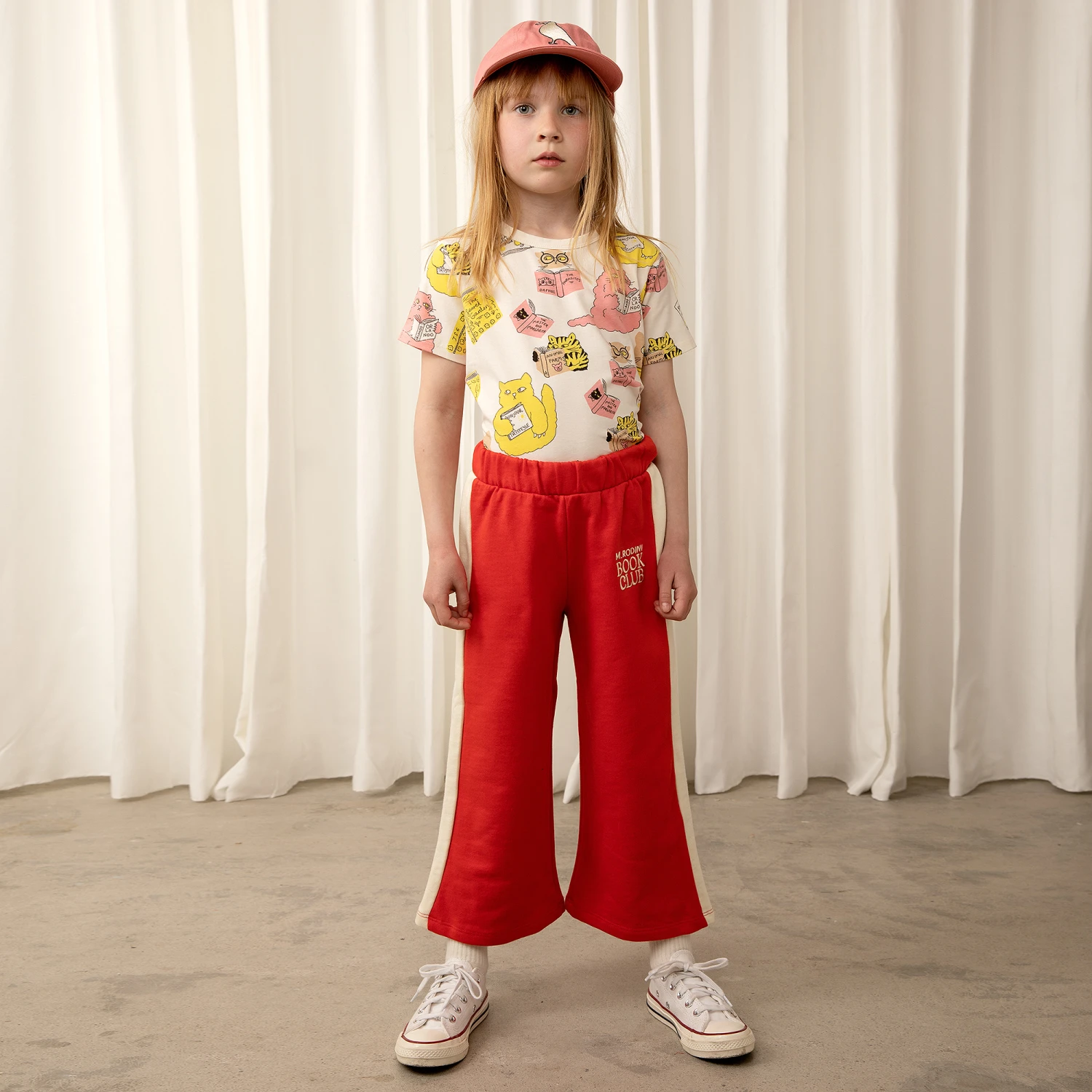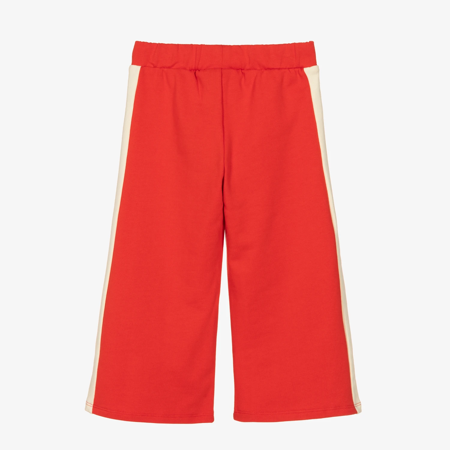 Funky red joggers for boys and girls from Mini Rodini, made in sustainable organic cotton jersey. With a slightly flared shape for a retro look, they have stripes down each leg and an embroidered book club logo on the front in contrasting ivory. They have an internal adjustable drawstring for a personalised fit.