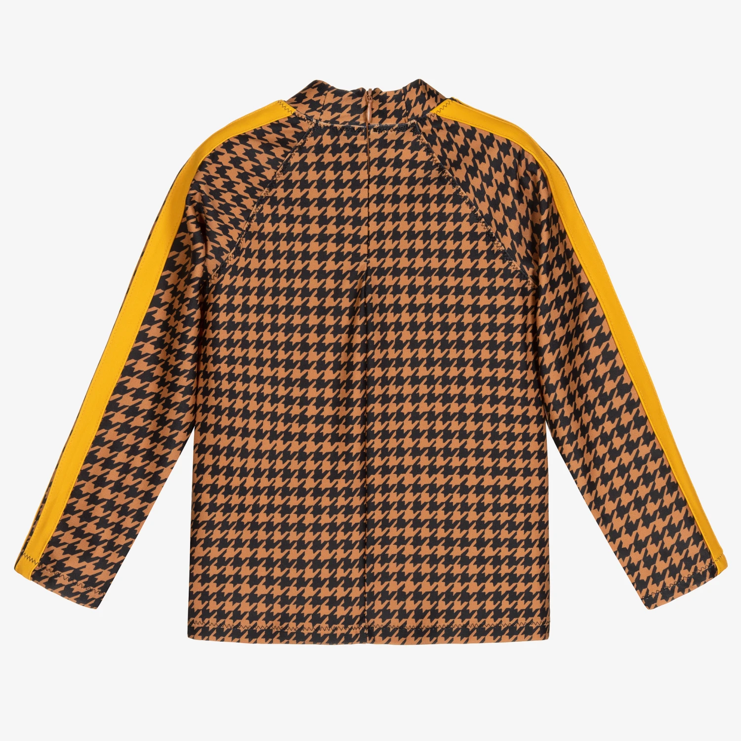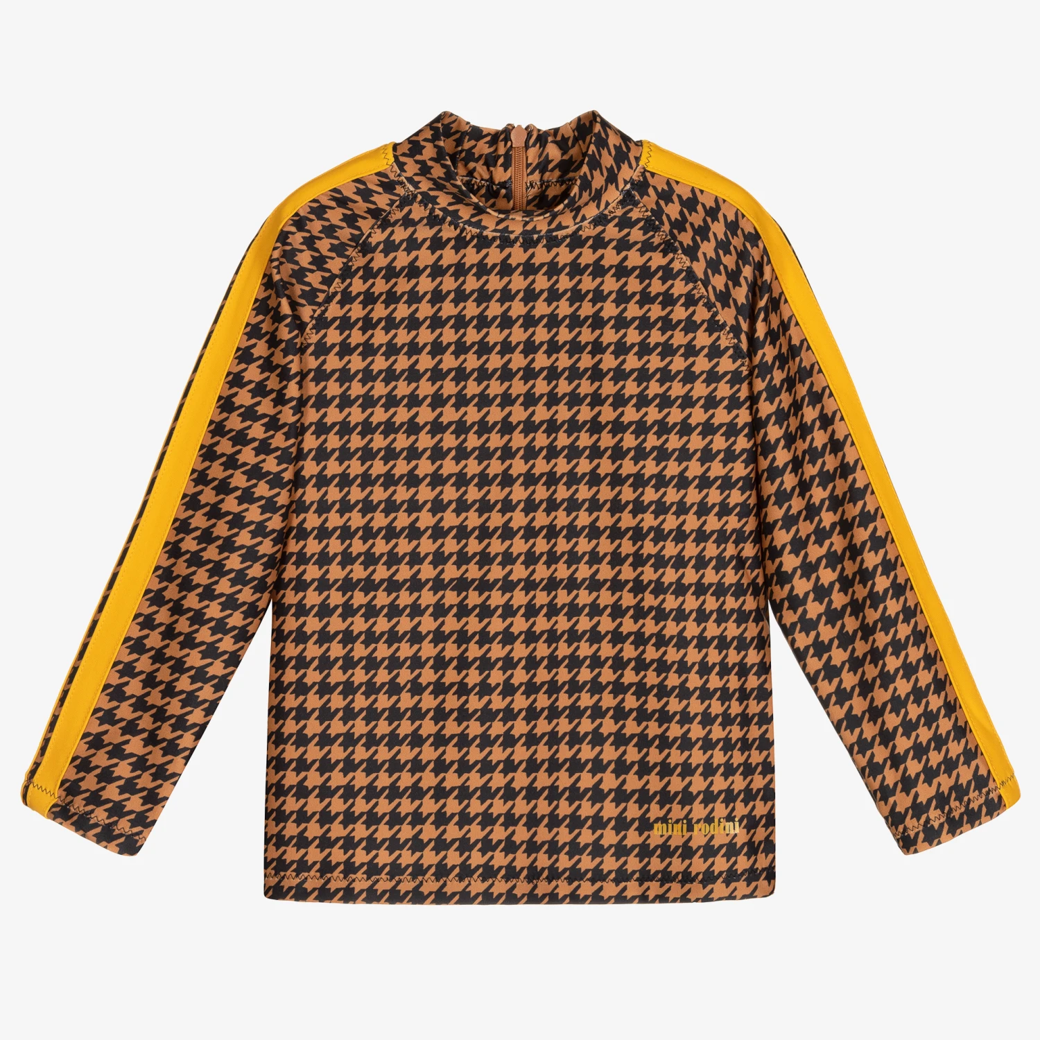 Sun protective, long-sleeved top for boys and girls by Mini Rodini, in a brown houndstooth check with dark mustard yellow trim. Made in recycled nylon with UPF50+ sun protection, it has a logo print on the front hem and a zip fastening on the back.