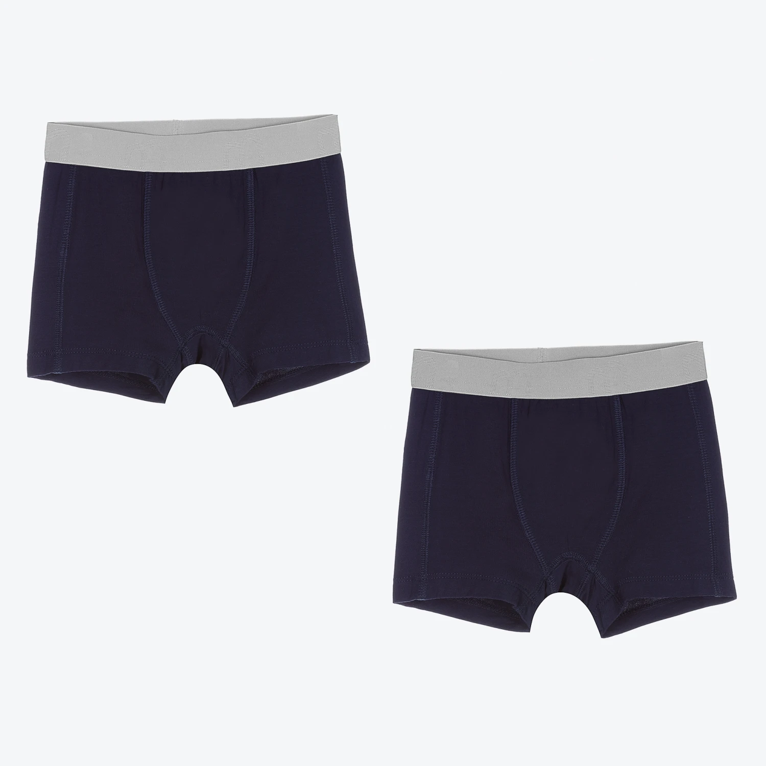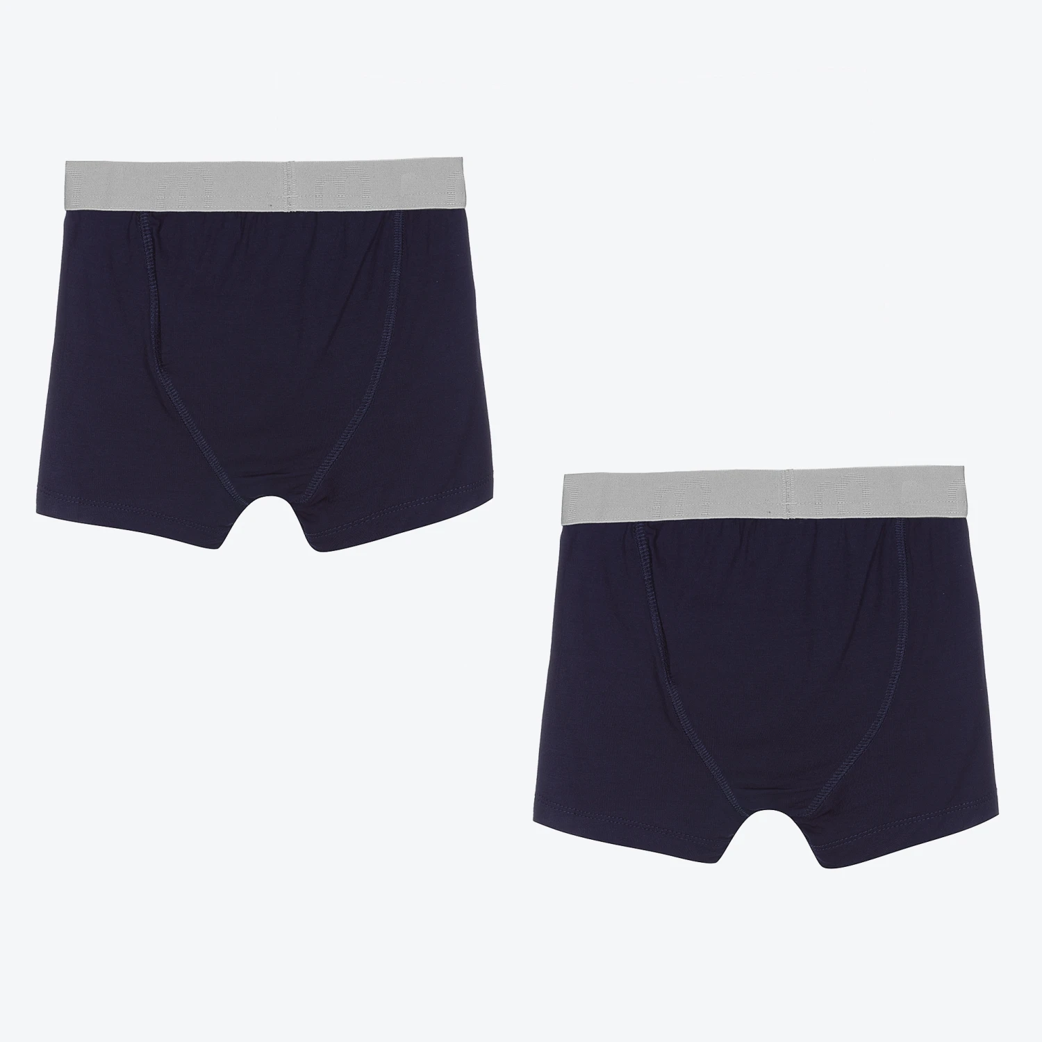 Pack of two pairs of navy blue boxer shorts for boys by Danish designer Minymo. They are made in super soft bamboo viscose jersey, which naturally regulates body temperature and is anti-bacterial. The elasticated grey waistband has repeat logos all around.