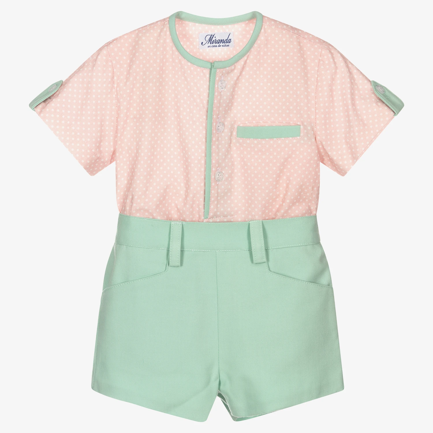 Boys pink and mint green shirt and shorts set by Miranda. Made in soft cotton, the smart-casual spotted shirt has front button fastening, a chest pocket and short sleeves. The matching mint green shorts are made in cotton twill and have an elasticated waistband and are fully lined.