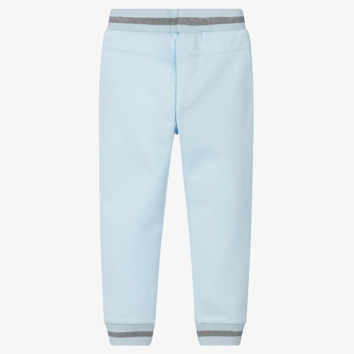Pale blue joggers for boys by Mitch & Son, with a grey logo print down one leg. Cosy and comfy, they are made in a soft viscose-blend jersey with grey striped ribbed trims. There are useful pockets at the front, and the waistband is gently elasticated and has drawstring ties for a good fit.