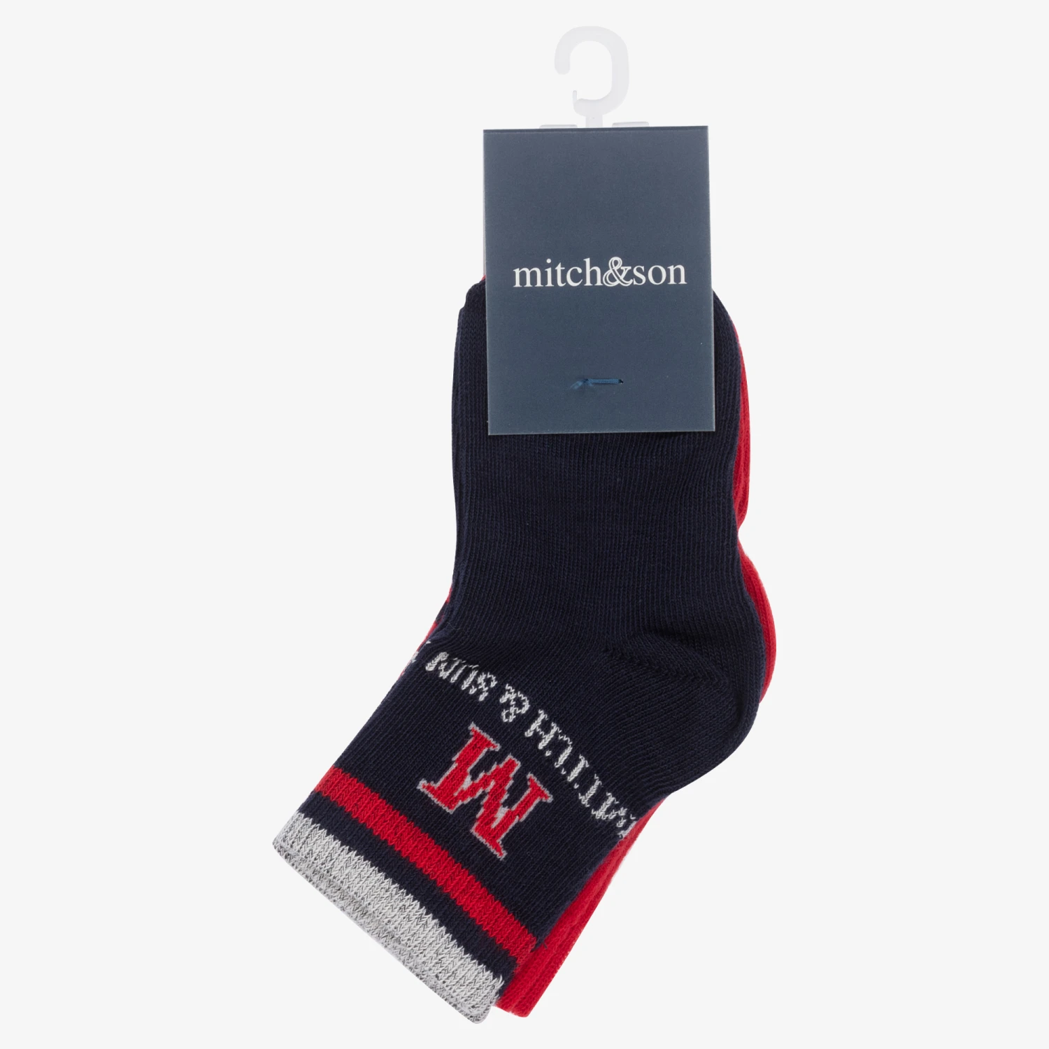 Pack of two pairs of socks for boys from Mitch & Son, in navy blue and red. Made in a soft and stretchy cotton-rich blend, they have contrast logo designs with stars and stripes around the top.