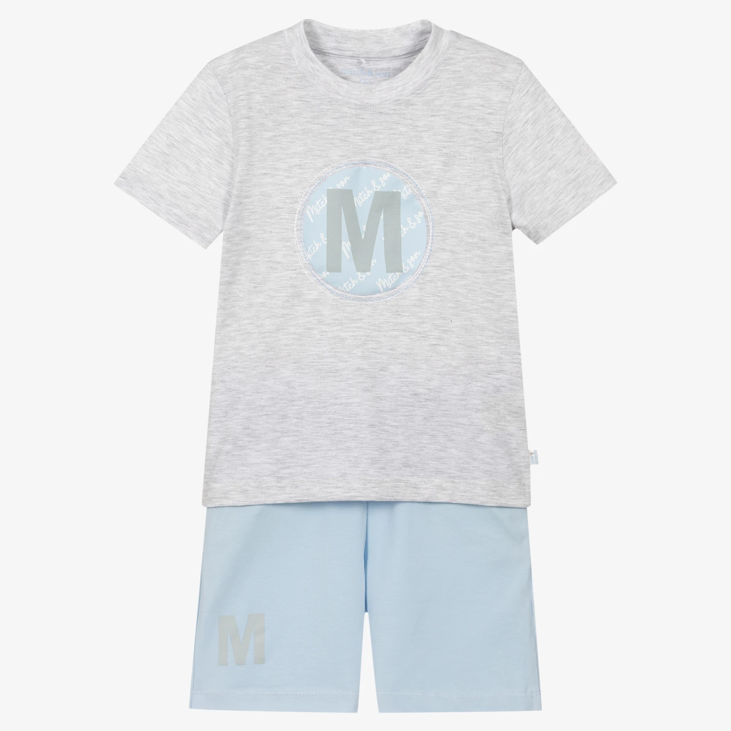 Casual grey and blue shorts set for boys by British designer Mitch & Son, made in soft cotton jersey. The T-shirt has a cool brand logo printed on the chest with intricate stitching and a subtle rubberised logo on the side. The matching shorts have a grey ‘M’ printed on one leg, useful pockets and a drawstring waistband.