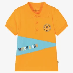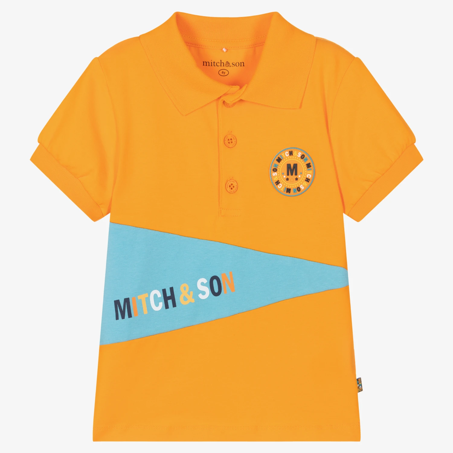 Bright orange polo shirt for little boys by British designer Mitch & Son, made in soft, breathable cotton jersey. This playful top features a contrasting blue insert and a rubberised logo on the chest. It has a ribbed collar and trims, with button fastenings on the front to ensure that dressing is easy.