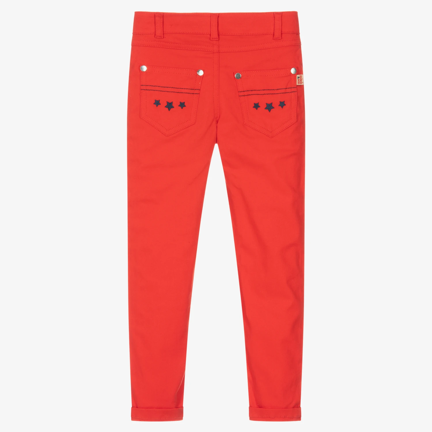 Casual red trousers for boys by Mitch & Son, made in soft cotton twill. They are in a classic five pocket style, with the coin pocket in contrasting navy blue. There are fixed turn ups and navy blue logo embroidery on one leg. They have a button and zip fastening, with a useful adjustable waistband.