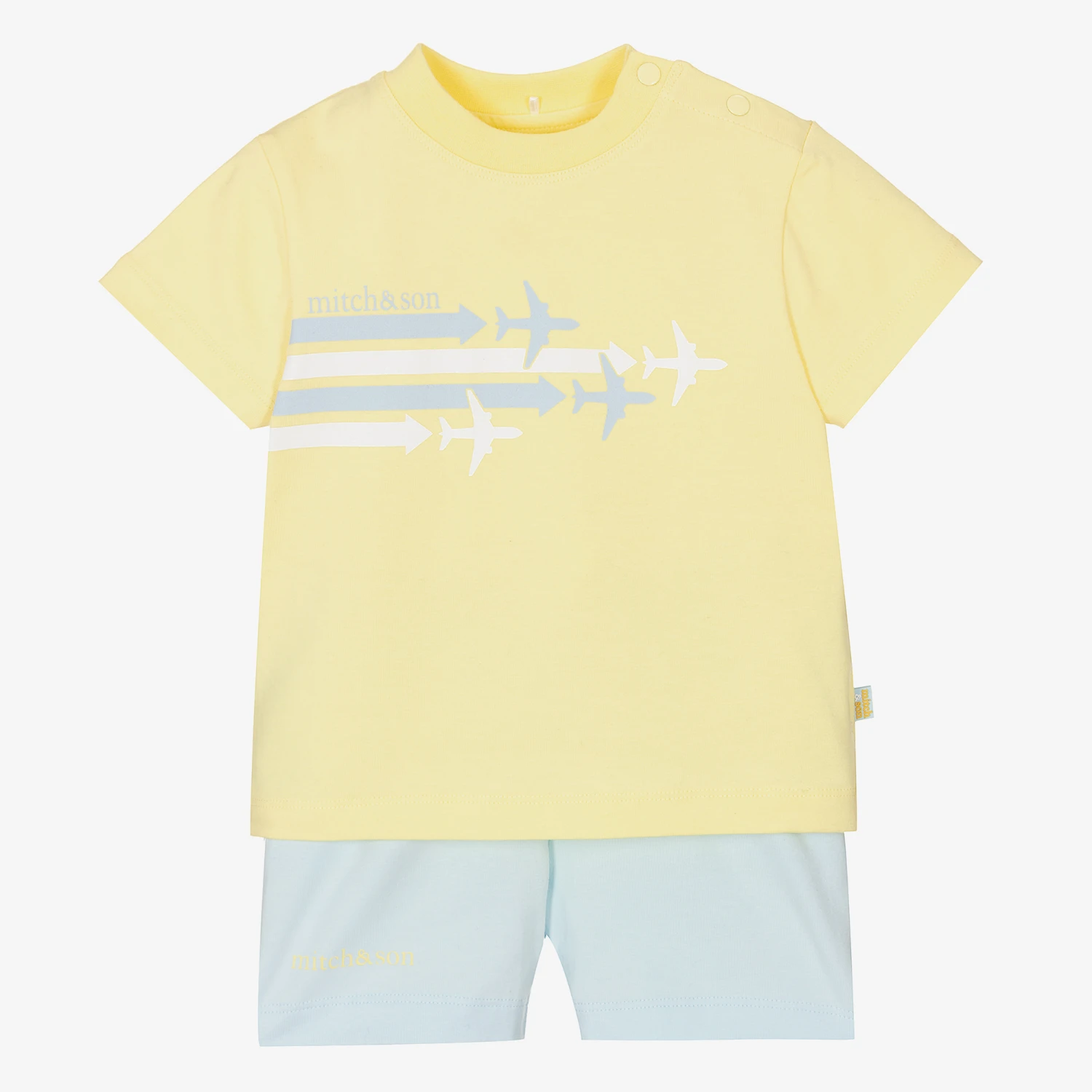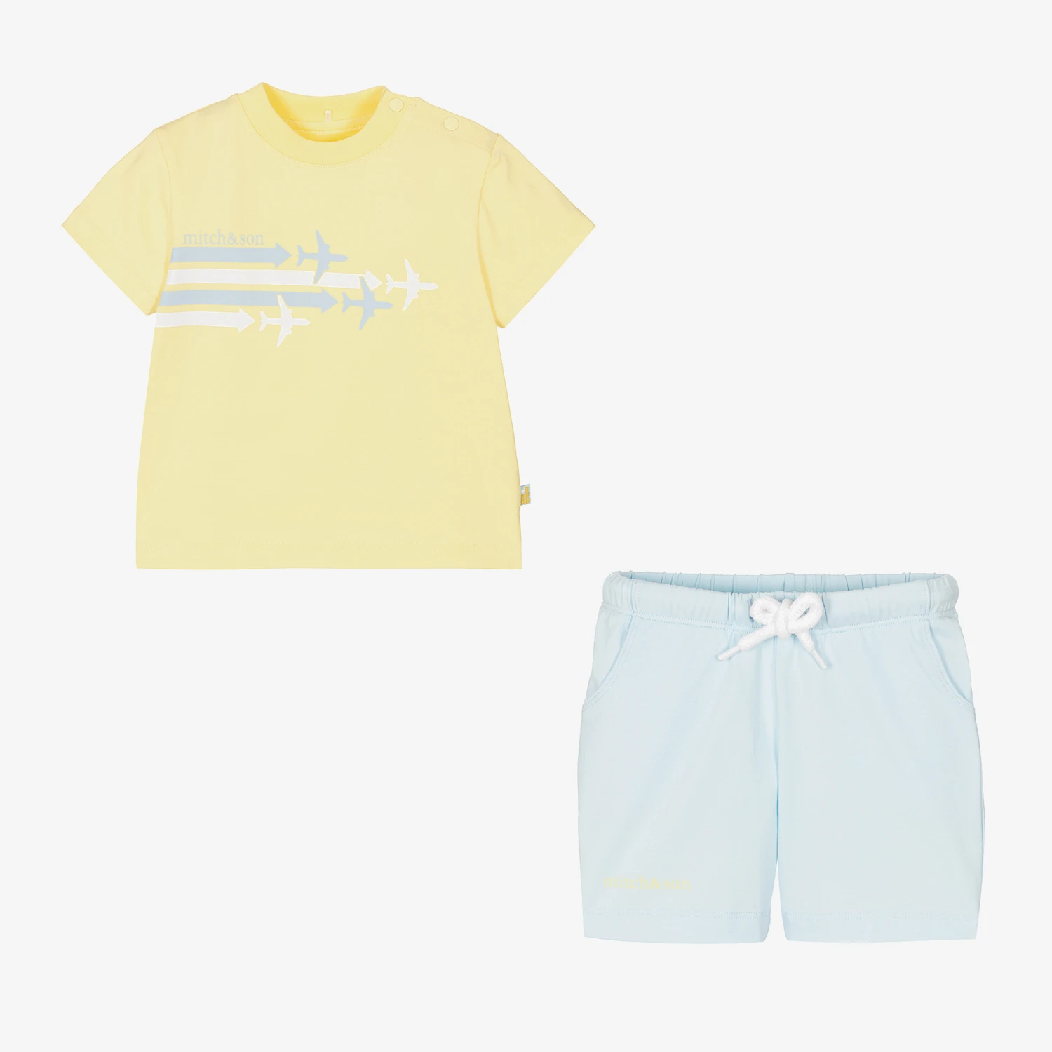 Casual yellow and blue shorts set for boys by Mitch & Son. Made in comfortable cotton jersey, the crew neck T-shirt has a white and blue aeroplane logo print on the front. Smaller sizes have popper fastening on one shoulder. It pairs with matching blue drawstring shorts, with yellow back pockets to coordinate the laidback look.