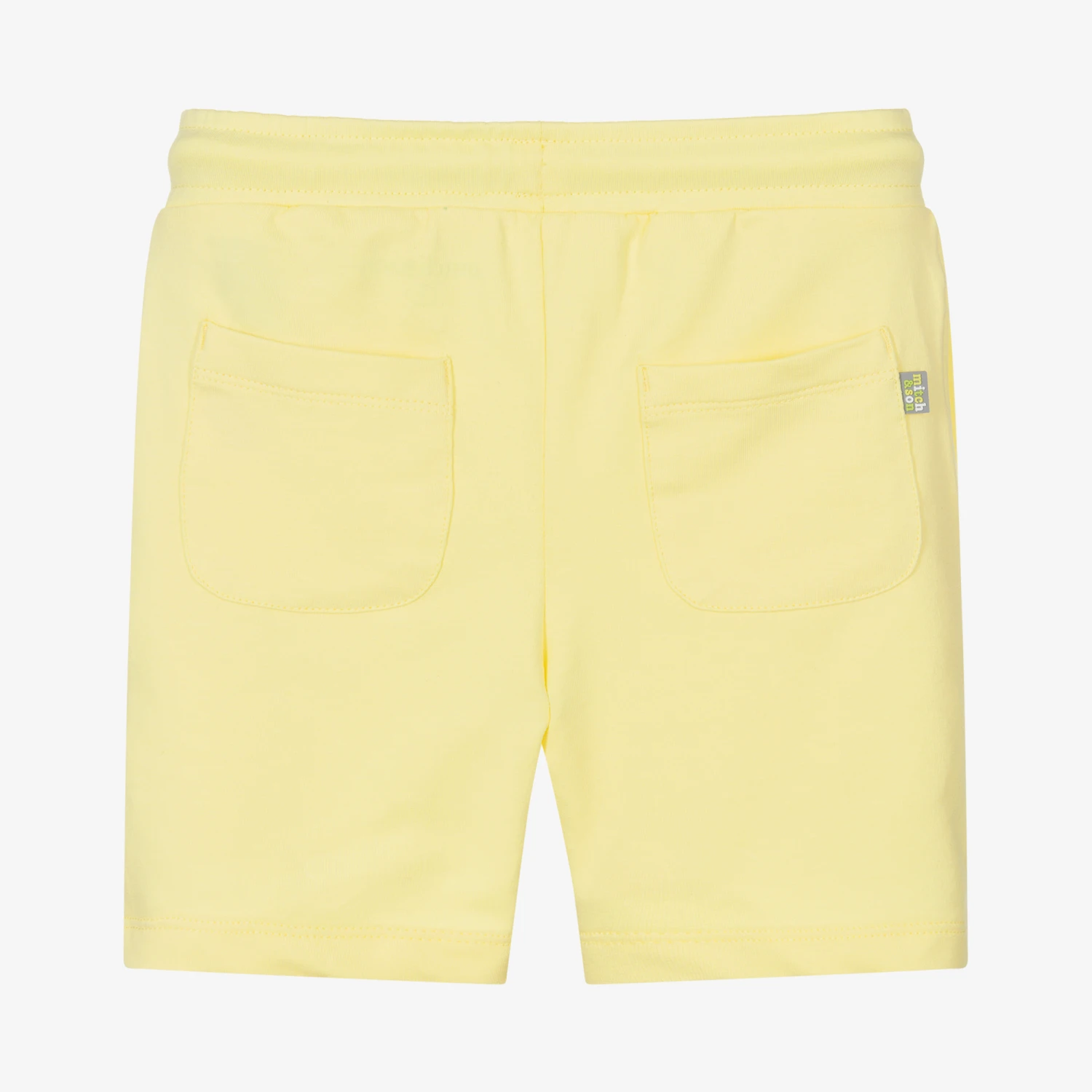 Light yellow shorts for little boys by British brand Mitch & Son, made in the soft and comfortable cotton jersey with a looped underside. Casually styled, they have a grey rubberised logo and a stretchy drawstring waistband.