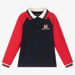 Little boys red and navy blue polo shirt from Mitch & Son. Made in soft and stretchy cotton jersey, this comfortable, lightweight top has a varsity-style logo print, striped trims and sporty raglan sleeves. It fastens with buttons on the front for easy dressing.
